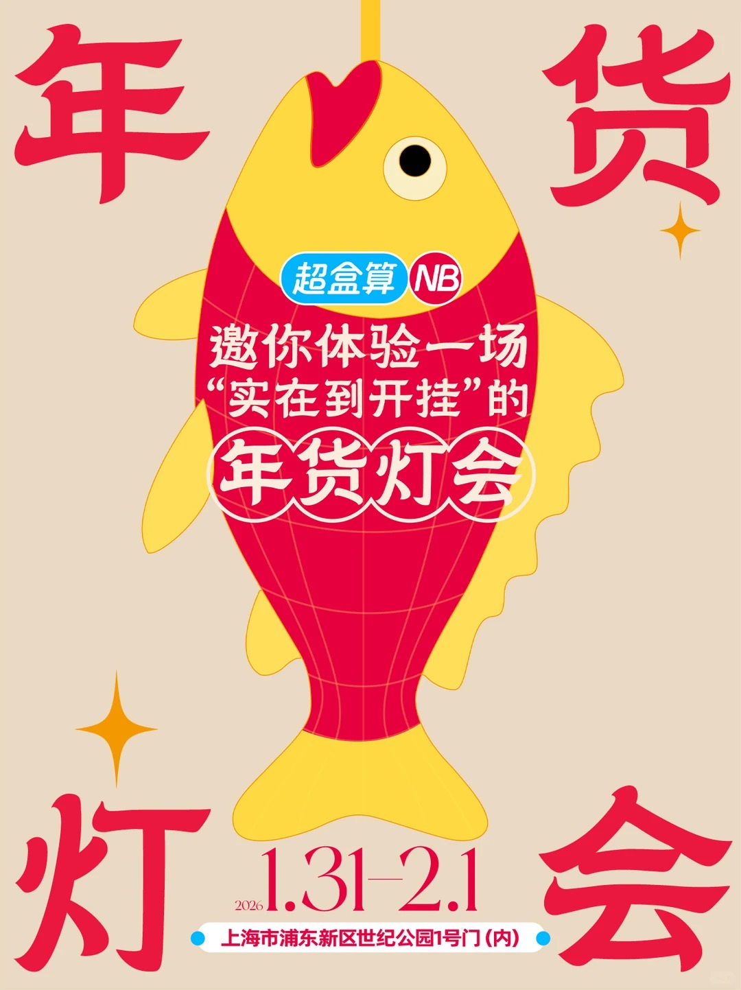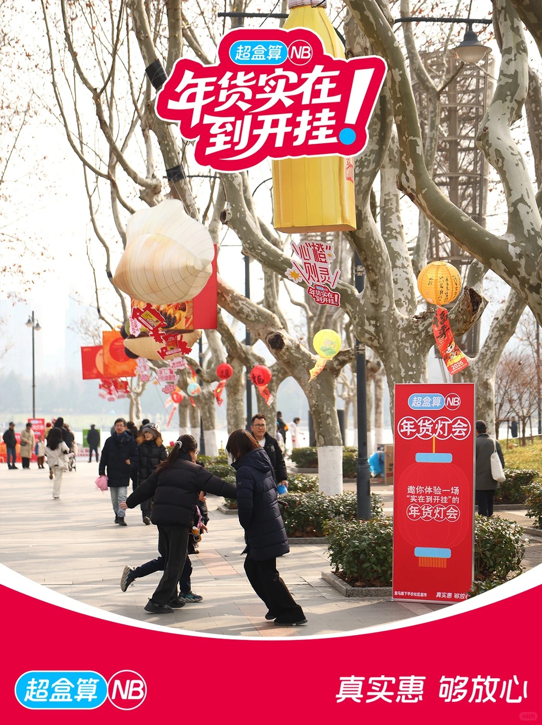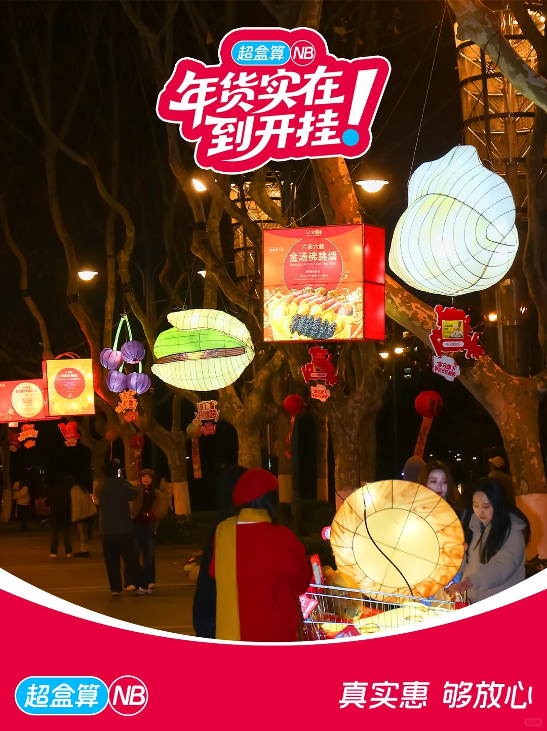 与此同时,1 月 31 日 - 2 月 1 日,超盒算 NB 超将货架上的年货搬进上海世纪公园,举办了一场「实在到开挂」年货灯会。现场,人气明星商品纷纷变身 XXXXL 号的「显眼包」灯笼——巨型「生蚝」、「三文鱼」「花生油」等商品在光影中惊喜亮相。市民不仅可观赏灯会,还可以参与打卡活动,领取年味灯笼毛绒挂件。
