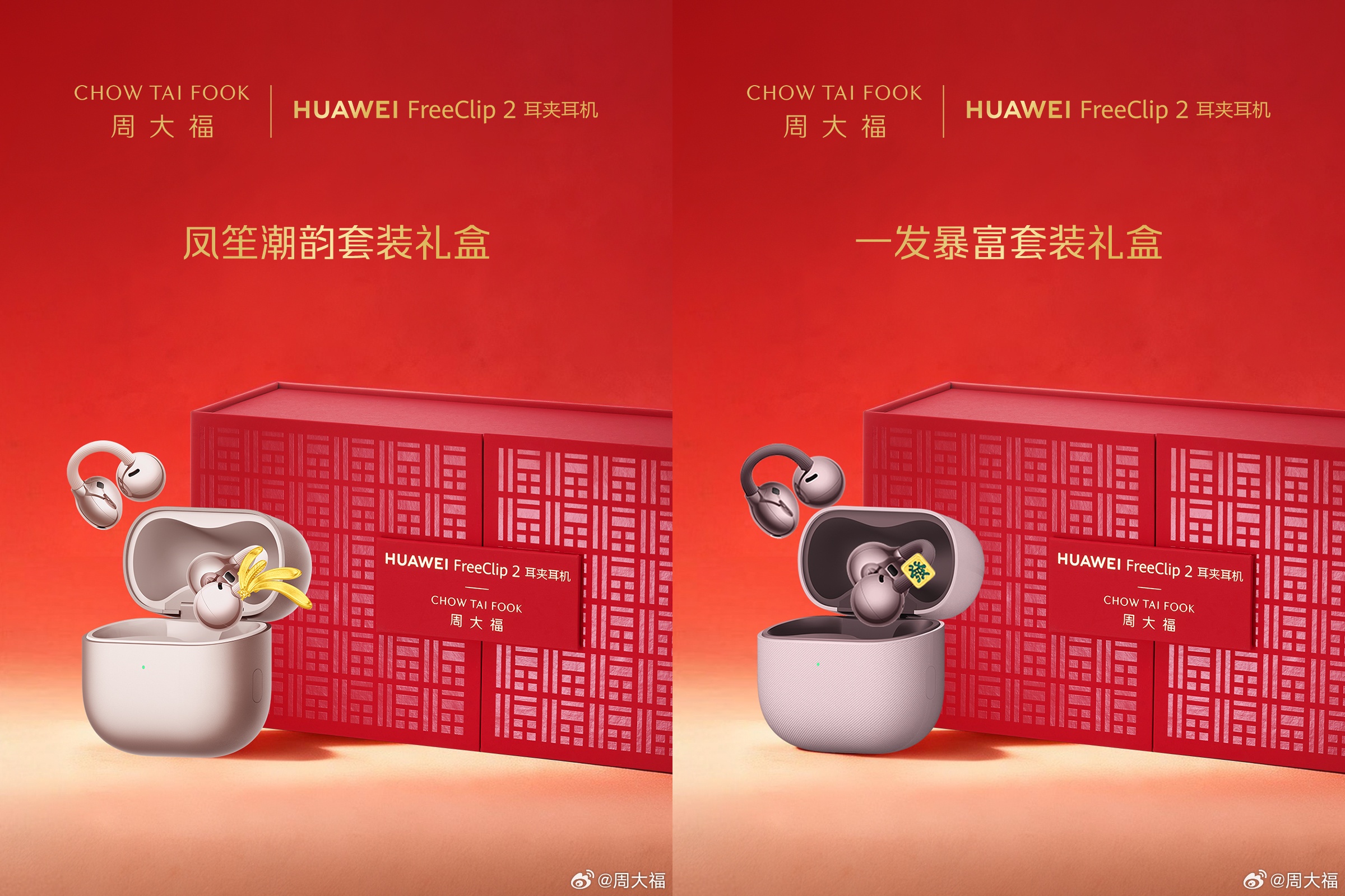 时值情人节与新春双节交汇,周大福特别呈现两款主题限量礼盒。「凤笙潮韵」礼盒内含华为 FreeClip 2 玫瑰金耳夹耳机,搭配「凤笙潮韵」足金饰品与手绳,以雅致意象诠释东方韵味;而「一发暴富」礼盒则包含华为 FreeClip 2 冰莓紫耳夹耳机,配以「发财小金砖」足金饰品及手绳,以活泼设计传递新年吉运。两款礼盒既承载美好祝愿,亦传递时尚态度,为重要时刻增添璀璨心意。