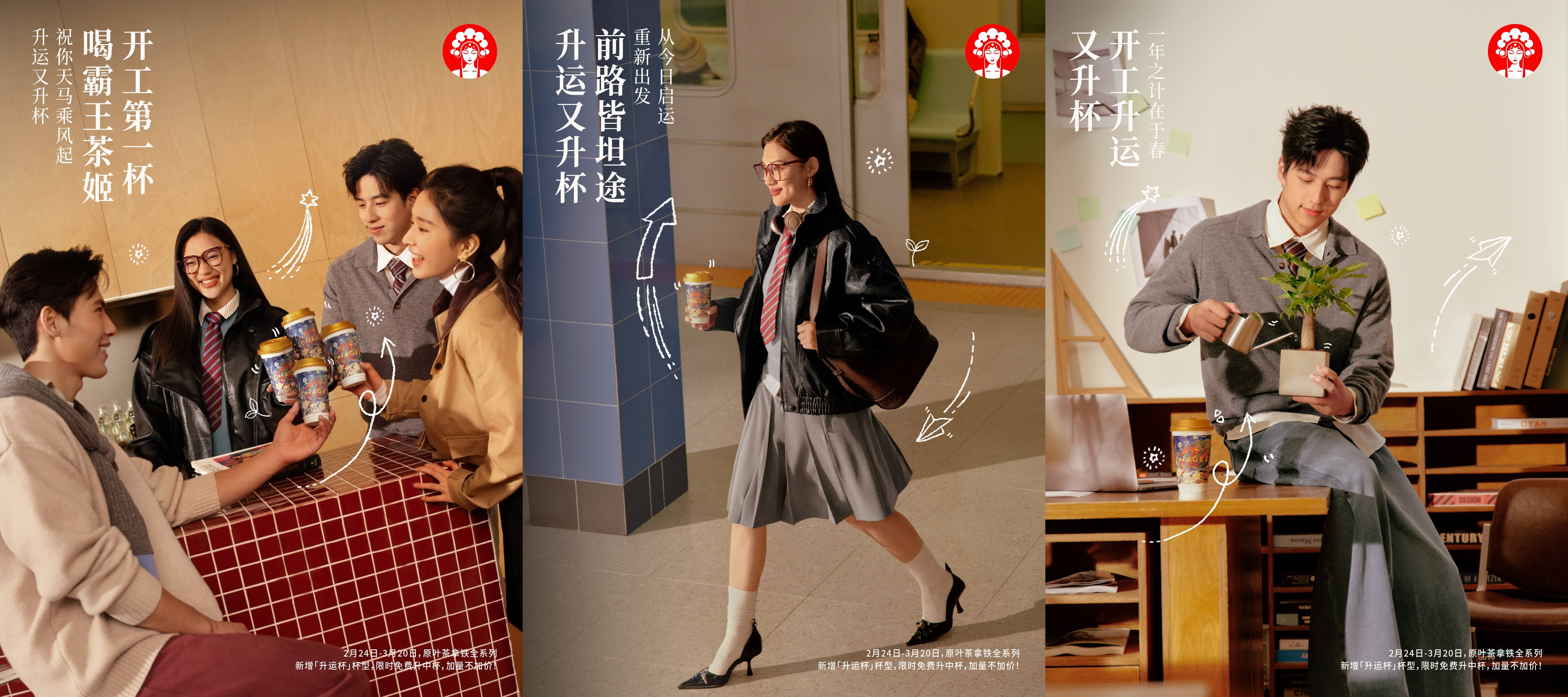 在全国范围内,2 月 24 日起至 3 月 20 日品牌也将联合敦煌博物馆为原叶茶拿铁全系列打造天马敦煌主题视觉并新增「升运杯」杯型,同步发起 #开工第一杯喝霸王茶姬 相关话题活动,发放 10000 杯「升运兑换券」,活动期间消费者还可以免费中杯升大杯,一起奔赴更开阔的天地,抵达好春光![SocialBeta]