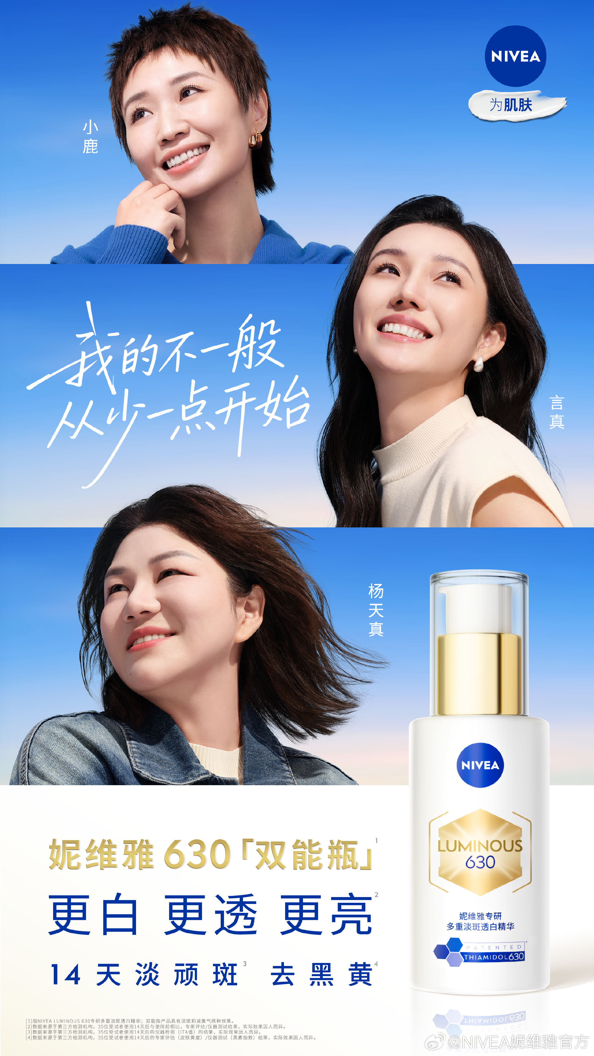 妮维雅希望通过这些典型女性为榜样,劝说更多女性放弃对社会规训的过度在意,而是忠于内心,让生命由自我定义。不仅如此「不一般」「少一点」的主题口号也与品牌王牌产品妮维雅 630 双能瓶精华的功效暗合,在品牌联合央视网携手权威检测机构 SGS 启动的「斑点追查」企划中,100 份真实记录和 28 天的「斑点追查」科学实证妮维雅 630 双能瓶美白力。当代女性身份不断叠加,多重身份带来的压力默默转化为色斑、暗沉、黄气等肤色挑战,妮维雅希望用一款好的淡斑美白产品,精准改善肌肤问题的同时,更能点亮她们的生活。[SocialBeta]