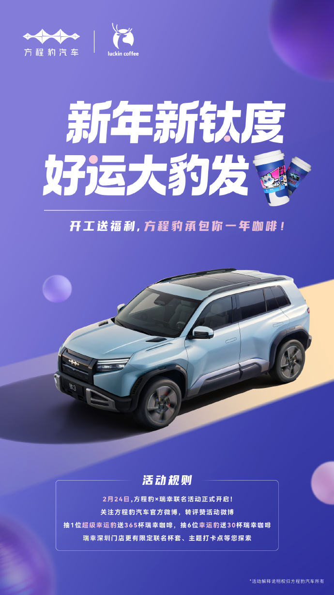 不仅如此,瑞幸还携手方程豹汽车,以「新年新钛度 好运大豹发」为主题展开联名活动。2 月 24 日起,双方在深圳千家门店同步推出限定联名杯套,邀请大家到店打卡。