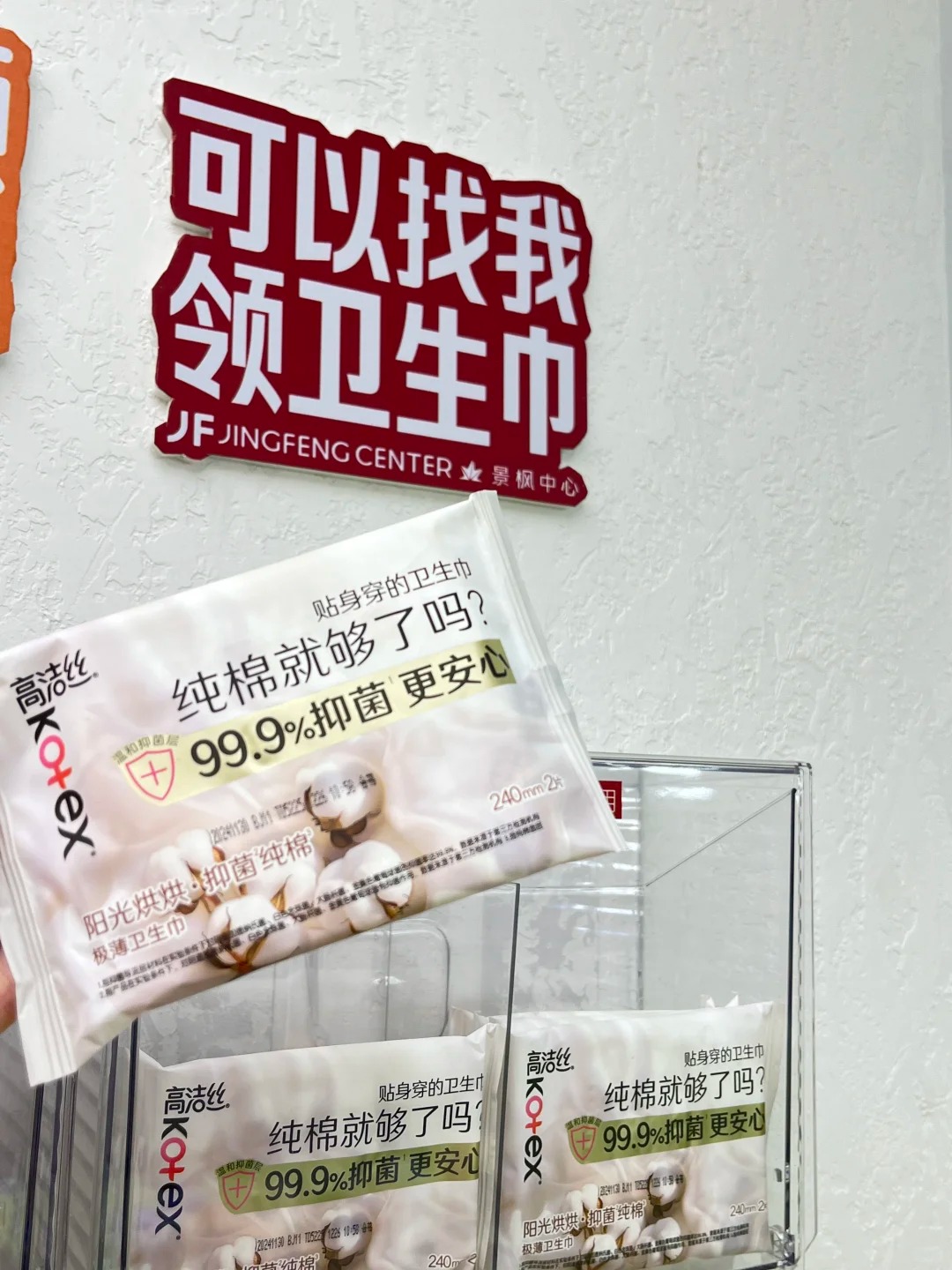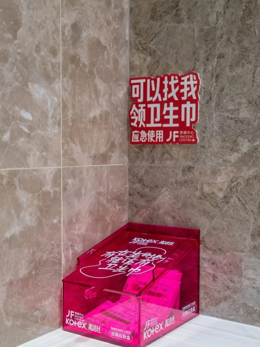 除此之外,景枫还联合高洁丝,在场内所有女卫生间均放置了卫生巾应急盒。这一举措让月经来访的女性无需开口求助或前往服务台,即可实现免费按需拿取,真正做到了让女性需求「不隐形」。