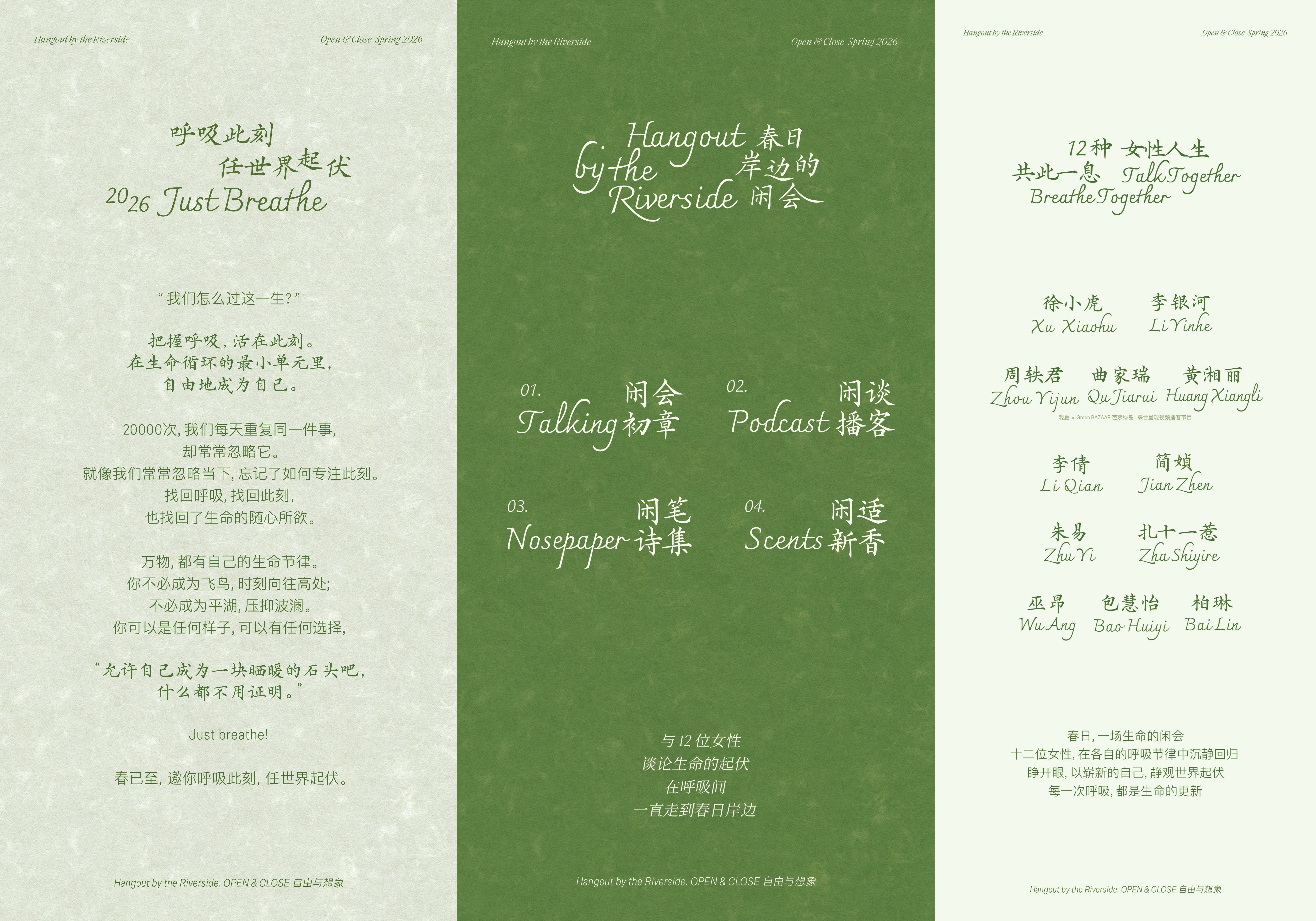 此外,品牌还携手 @GreenBAZAAR芭莎绿岛,邀请纪录片导演、写作者周轶君,分别对谈艺术家曲家瑞、戏剧演员黄湘丽。在发布的「春日岸边的闲会」系列视频播客第一集中,曲家瑞便也坦诚自己并不总是清晰、坚定、向上。在任何年龄阶段,人都要面临内耗和怀疑,遗憾与失去。就如徘徊、犹疑、停顿,都是呼吸的一部分。但她鼓励大家在每一个「此刻」尽兴去活。真正决定人生的,不是某个遥远的终点,而是每一个具体的「此刻」。在「呼吸」这个最小的生命循环里,大家都可以自由地成为自己。