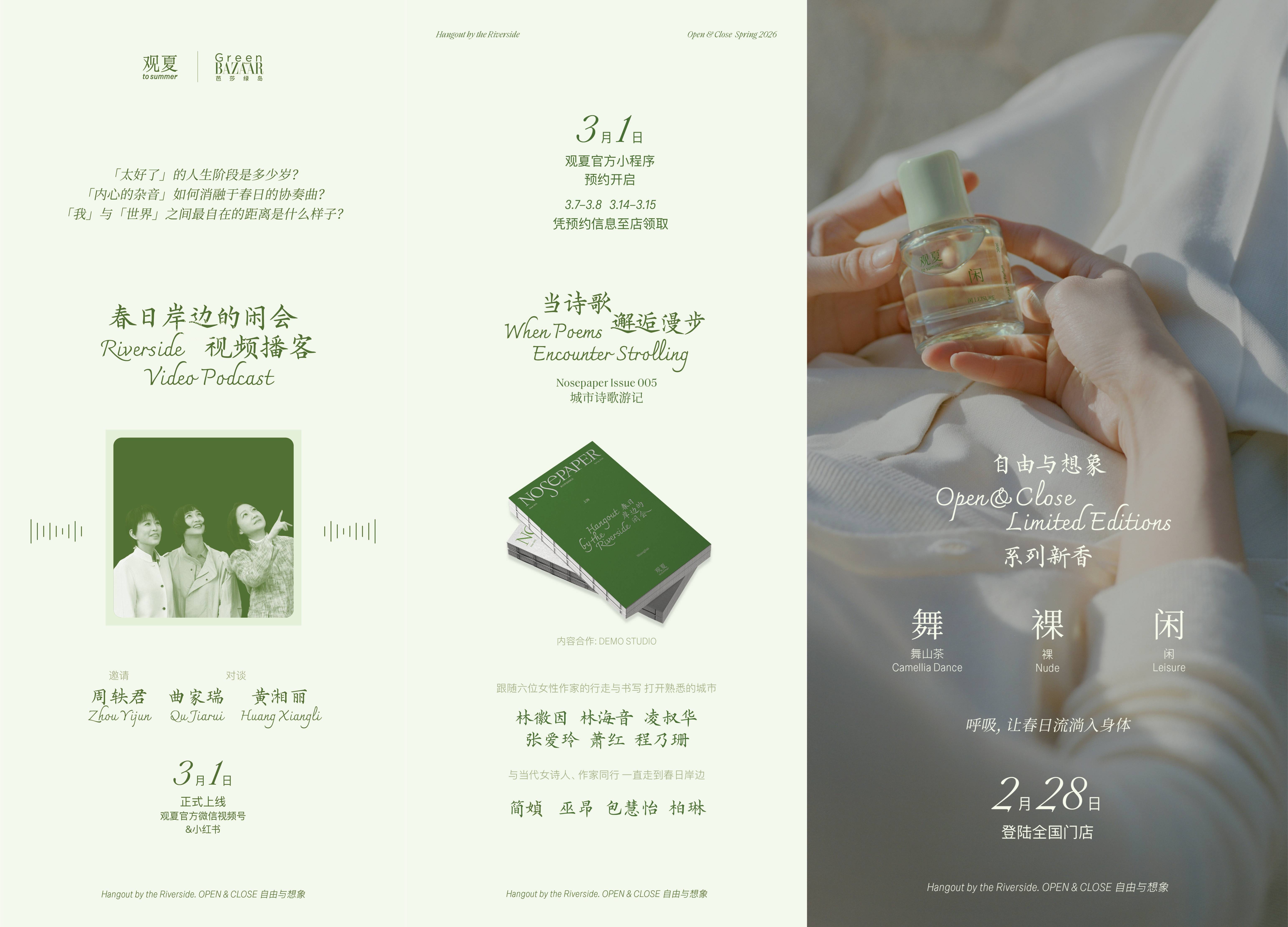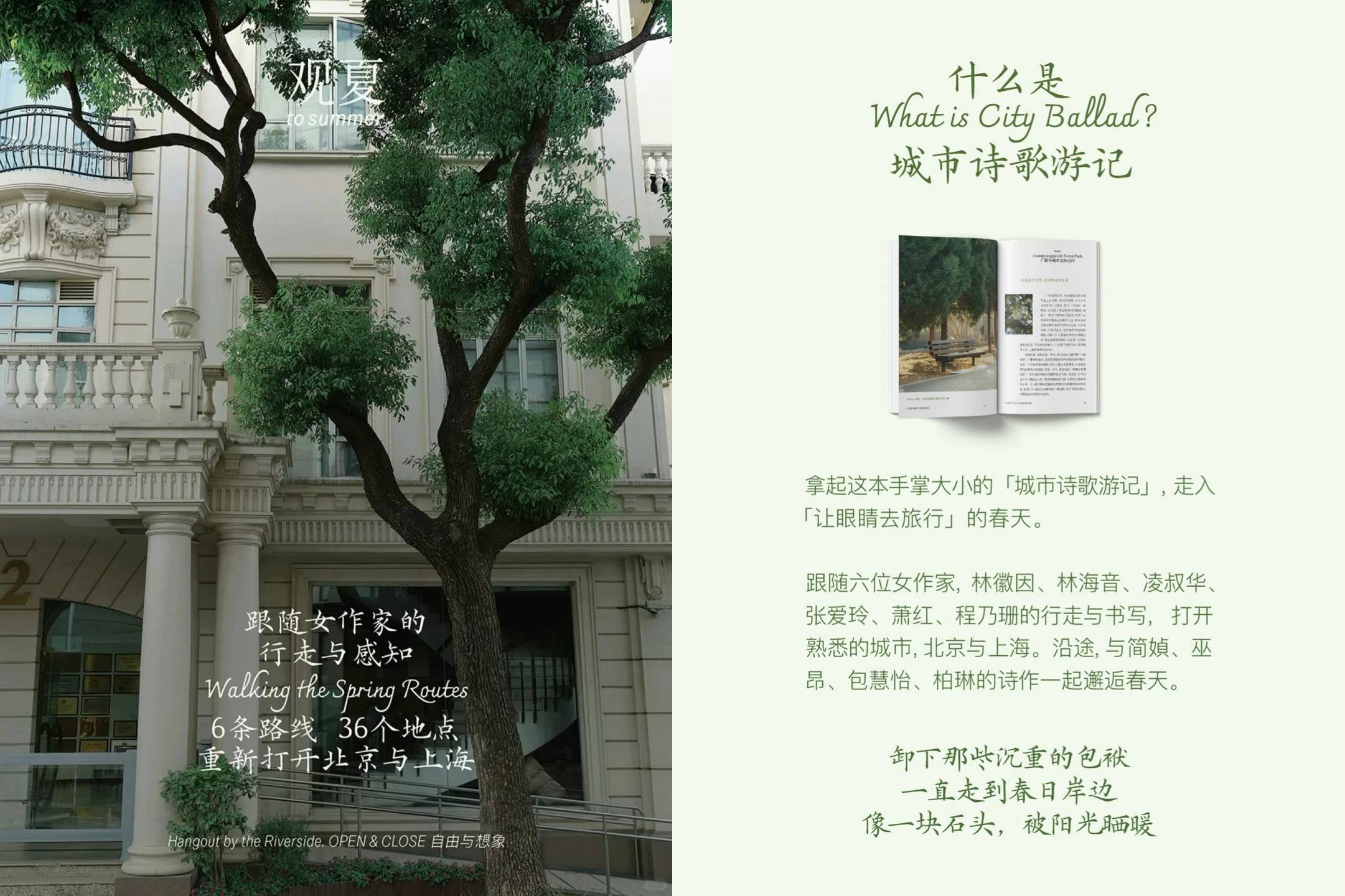 与此同时,新一册 Nosepaper 也将诞生,在这本城市诗歌游记中,品牌于北京、上海两座城市,分别沿着三位女性文人的生活轨迹,在城市中划出三条文学漫步路线。北京,从凌叔华、林徽因到林海音;上海,从张爱玲、萧红到程乃珊。每一条路径,都是一次在熟悉城市中重新感知春天的方式。简媜、巫昂、包慧怡、柏琳等女作家的诗句,作为随行的指引,陪伴大家在行走之间,与春日的气息靠得更近。钻进城市画卷中轻盈自得的角落,呼吸此刻的春天,走入一场深绿色的永恒梦境。