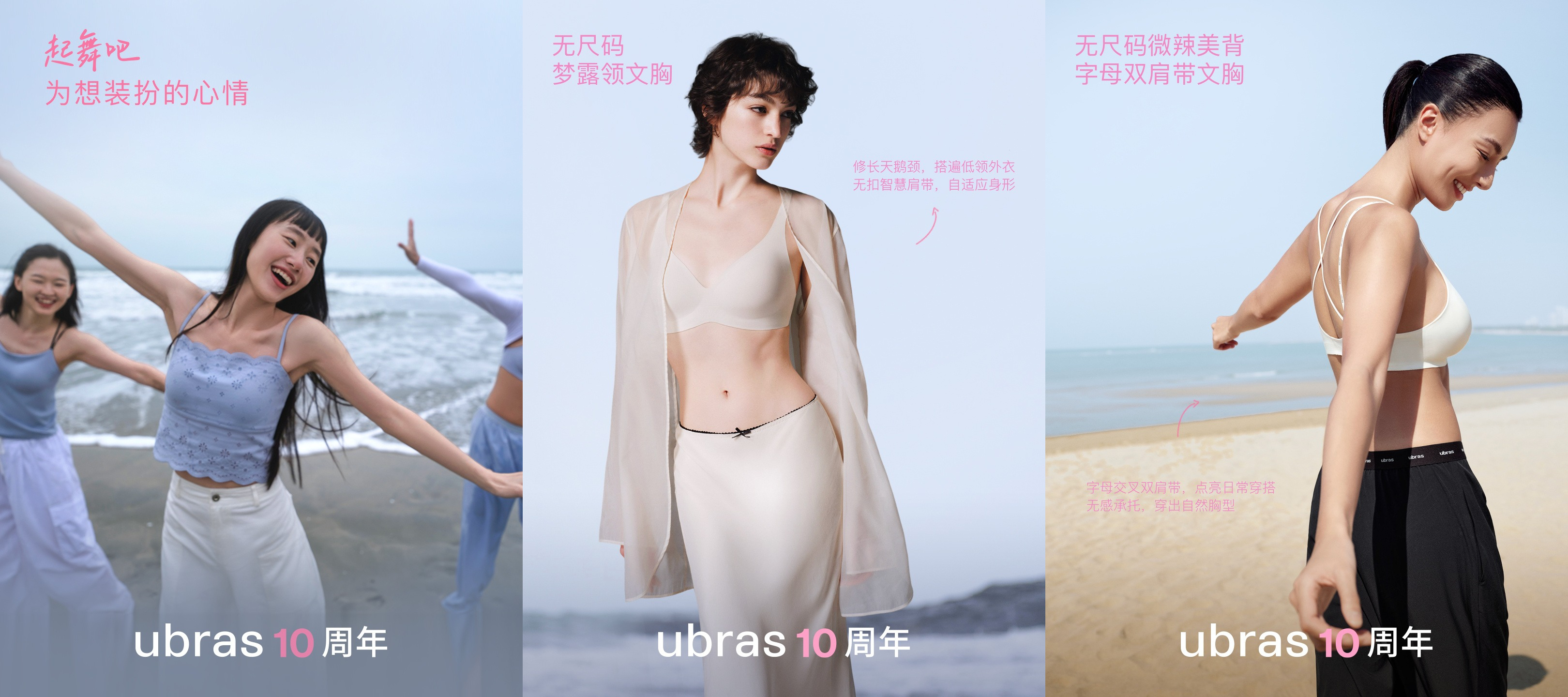 为此品牌特别发布十周年「为日常起舞」特别企划,发布全新广告片,并联合青山音乐一起首发十周年主题曲《uba uba》,用轻快愉悦的音乐将身体的感受转译成一个个音符,串联起身体与情绪的共感,变成耳朵里的治愈。每一次伸展,跳跃,都可以是起舞的开始;有时,一件舒服的内衣,一个轻盈的转身,也可以是起舞的开始,十周年无尺码限定系列也将限时上新,用无尺码的舒适庆祝日常每一天。