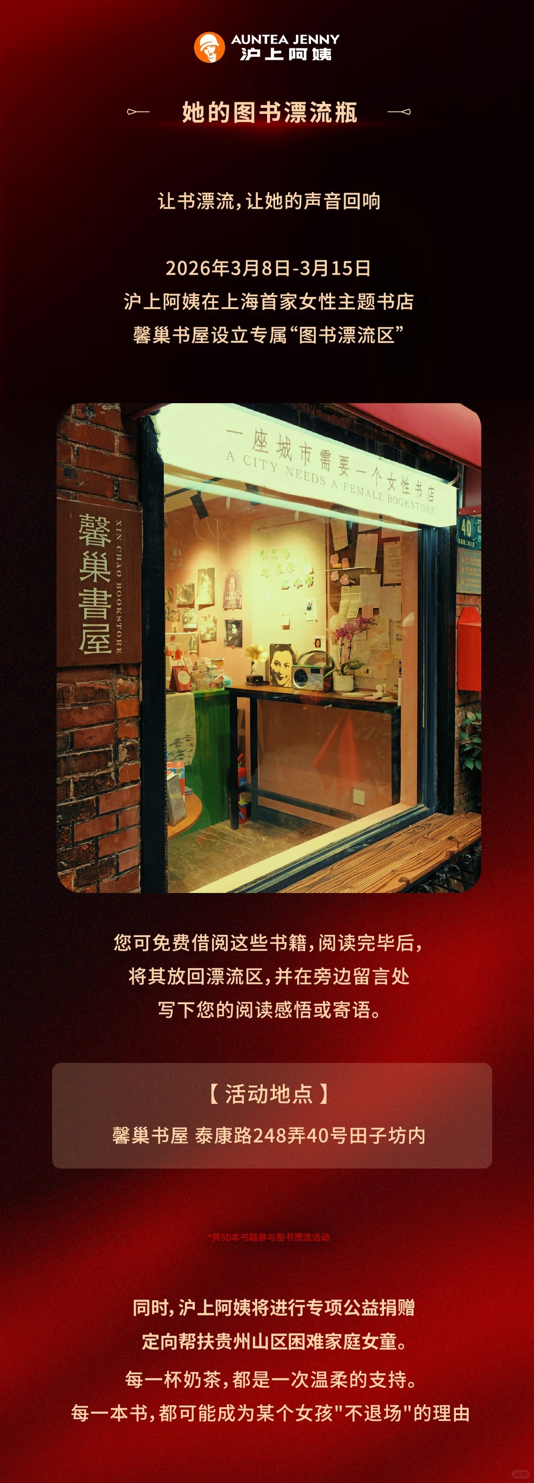 图书漂流瓶的活动,从 3 月 8 日至 15 日,沪上阿姨在馨巢书屋(上海田子坊店)设立公益漂流区,提供 50 本书籍免费借阅。读者可在漂流区留言分享感悟,沪上阿姨同步捐赠书籍帮扶贵州山区女童。而沪上阿姨也提出,每杯奶茶的消费,将用来支持山区女童教育。