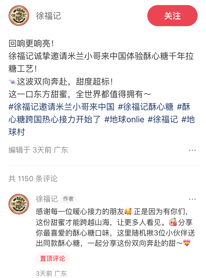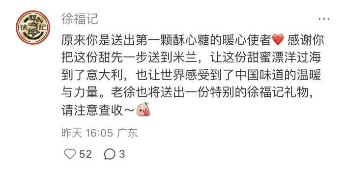于是,这位前台小哥不仅收到了来自不同的中国人带去的酥心糖,也成为许多中国游客米兰之行的打卡第一站。而这场温暖的跨国叙事也带动了徐福记在多国代购订单的激增。