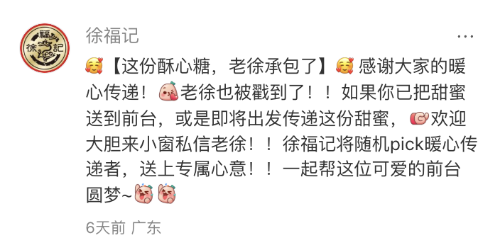 官方也第一时间下场回应,接住了这波「泼天富贵」:一方面为参与「投喂」任务的热心网友准备了新年礼物,还发起互动活动,表示将随机选择「暖心传递者」,助力前台小哥圆梦;另一方面,品牌还为前台小哥寄送了整箱全口味酥心糖,并承诺承包他一整年的糖果需求。