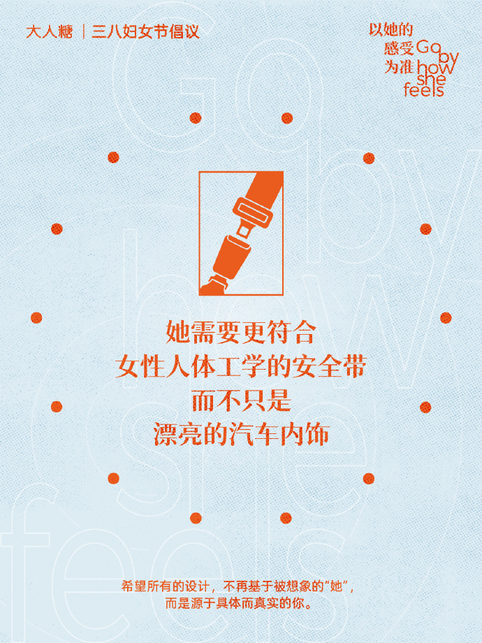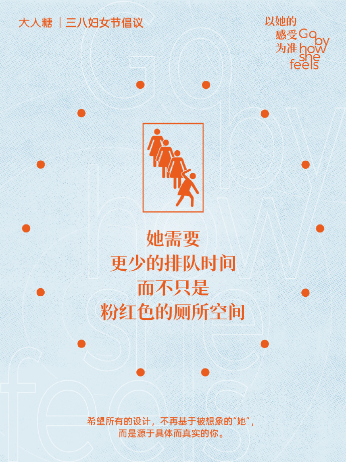 大人糖在倡议中坦言,生活中诸多看似为女性设计的物品与空间,实则是基于「社会观念中的女性」打造的——磨脚的高跟鞋、口袋狭小的紧身裤、漂亮的汽车内饰、粉色的女卫生间......这些设计如此常见,以至于让女性几乎相信:美丽必然伴随疼痛,得体必然伴随不适,费时与等待是常态。这些看似为女性好的设计,却忽略了她们的生理差异与真实需求,将标签化的美感设计置于舒适与便利之上。