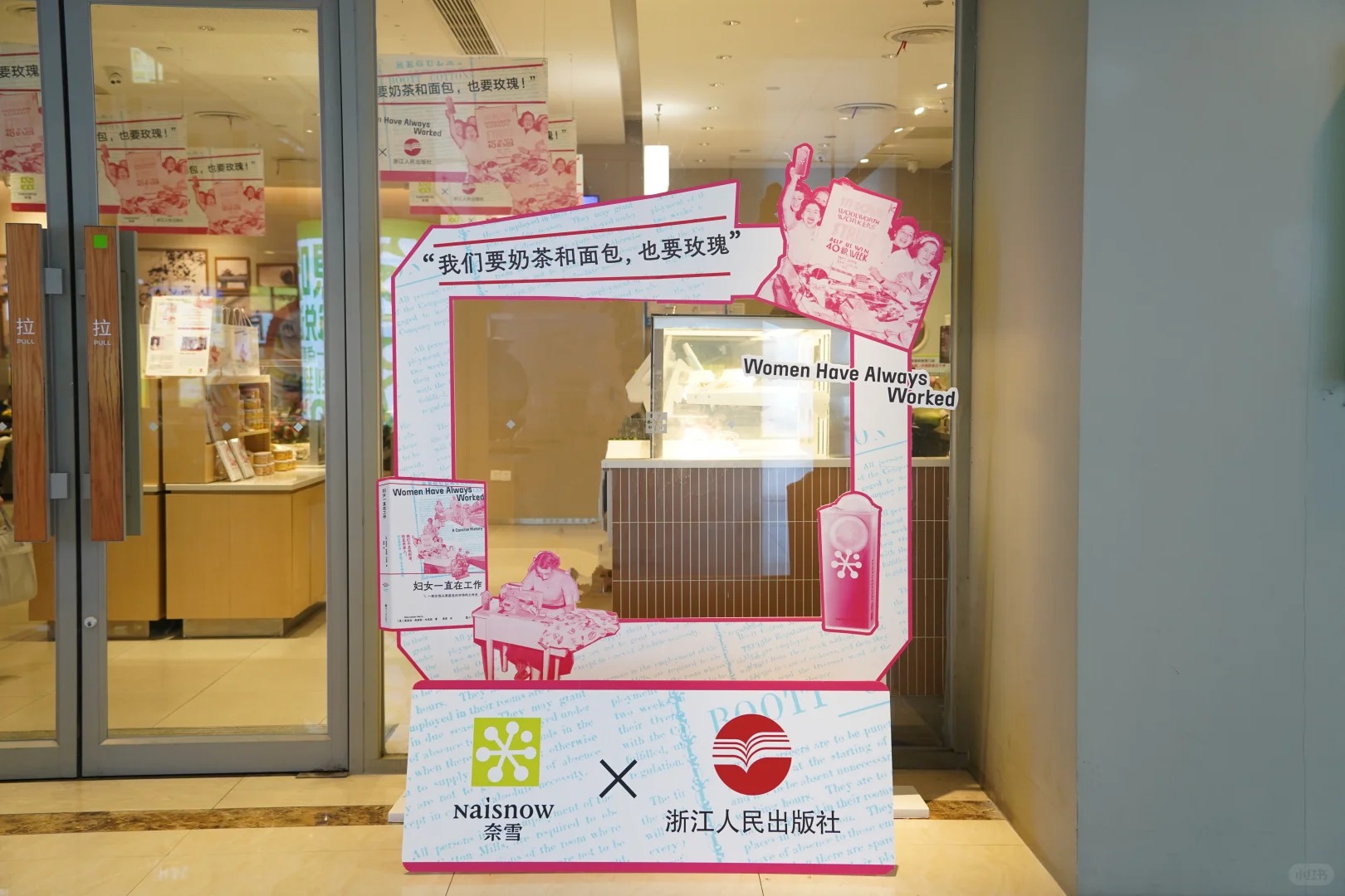 同时,双方在杭州大厦中央商城打造了一家限定主题门店,并专门陈列出了《妇女一直在工作》的样书,消费者在购买联名奶茶的同时亦可在现场选购书籍。