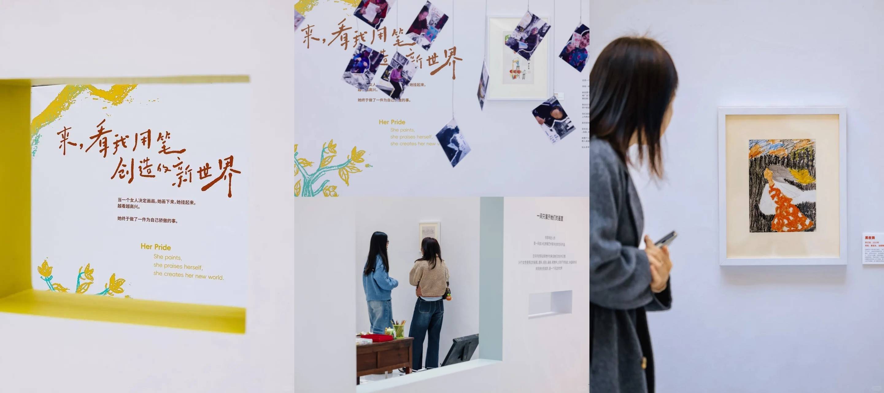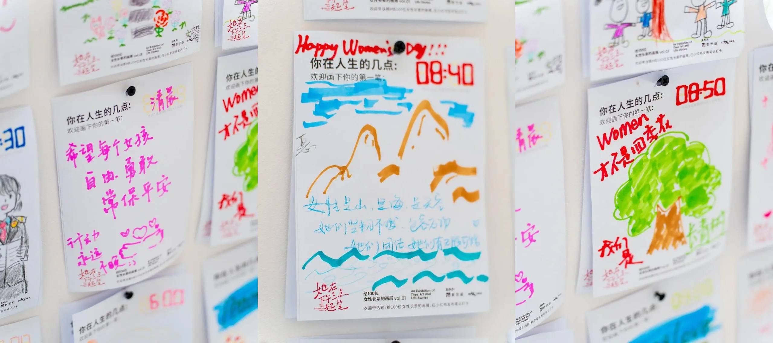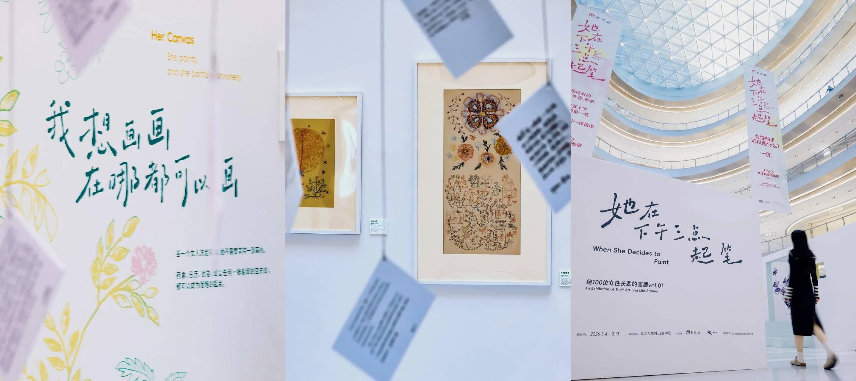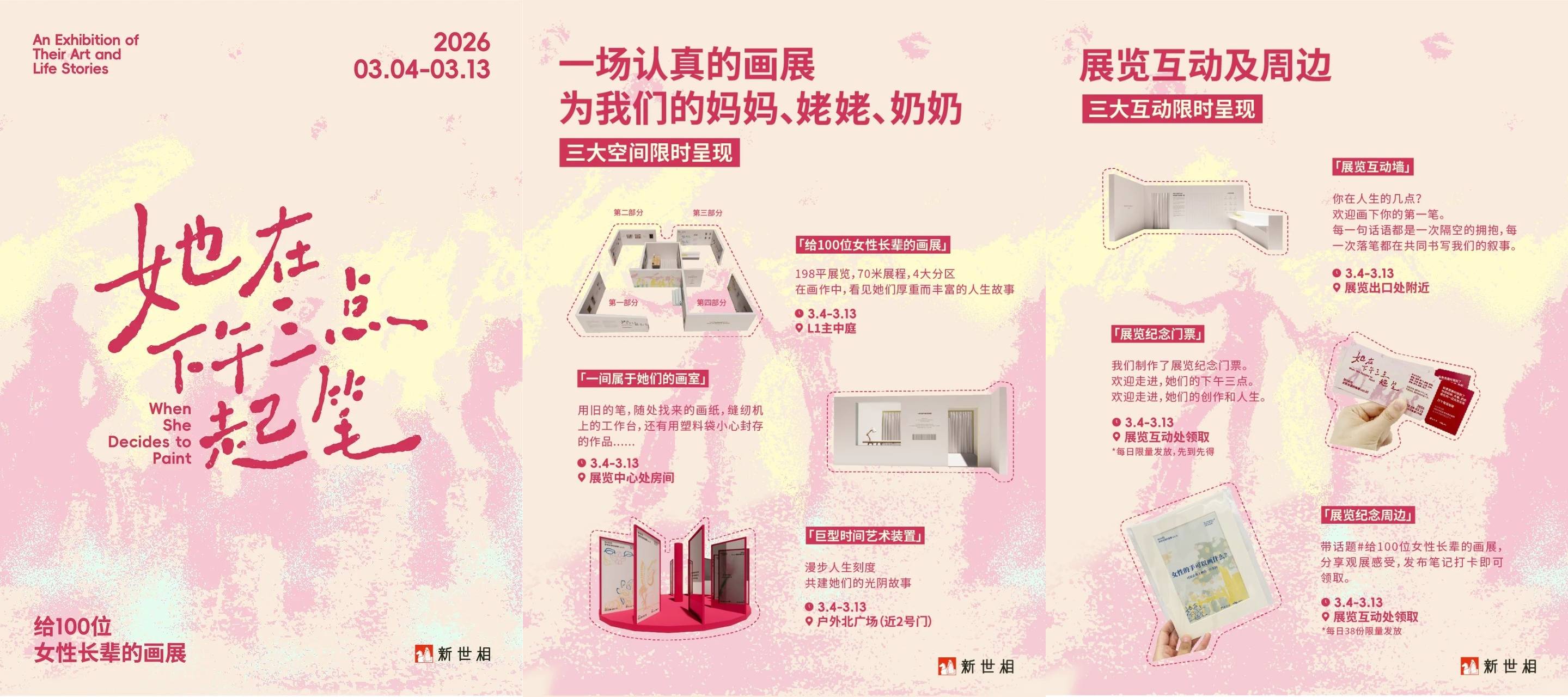 但也正因此,平台更想郑重其事地对待她们的画,郑重其事地对待她们的故事和人生。观众可以在现场看到一个只为她们搭建的198 平米的限时美术馆。全长70米的展墙上,展示的是她们精选的画作,以及画作背后,厚重而丰富的人生故事。不仅如此,画作以外展览中还特别设置了一面展示她们创作状态的影像墙;一间由她们的创作碎片搭建而成的「只属于她们的画室」;一块空白展墙,期待由现场观众创作的第一笔来填满。此外,平台还准备了展览纪念门票和纪念周边,还邀请了这 14 位女性长辈写下祝福,欢迎大家前来观展和领取。