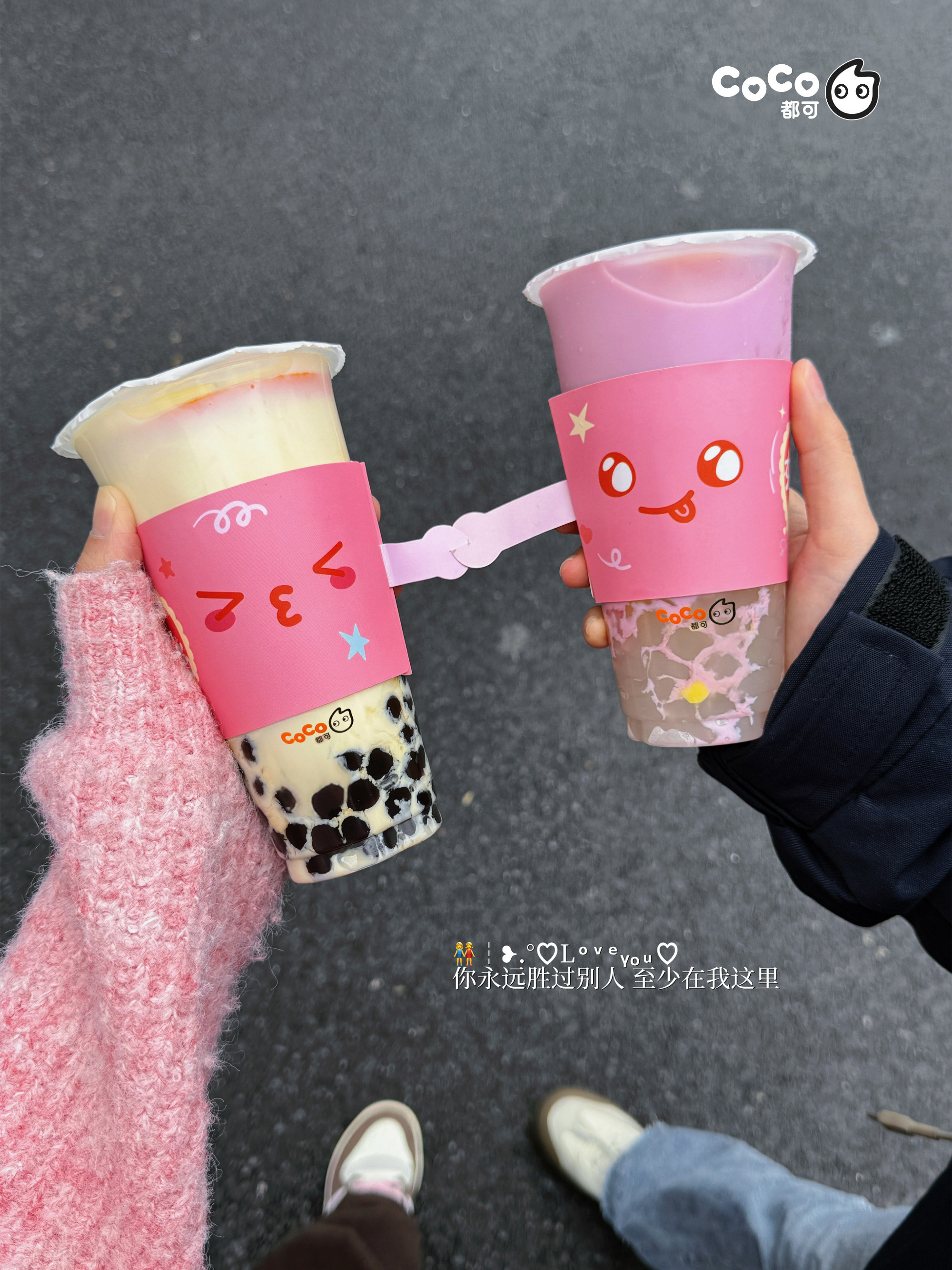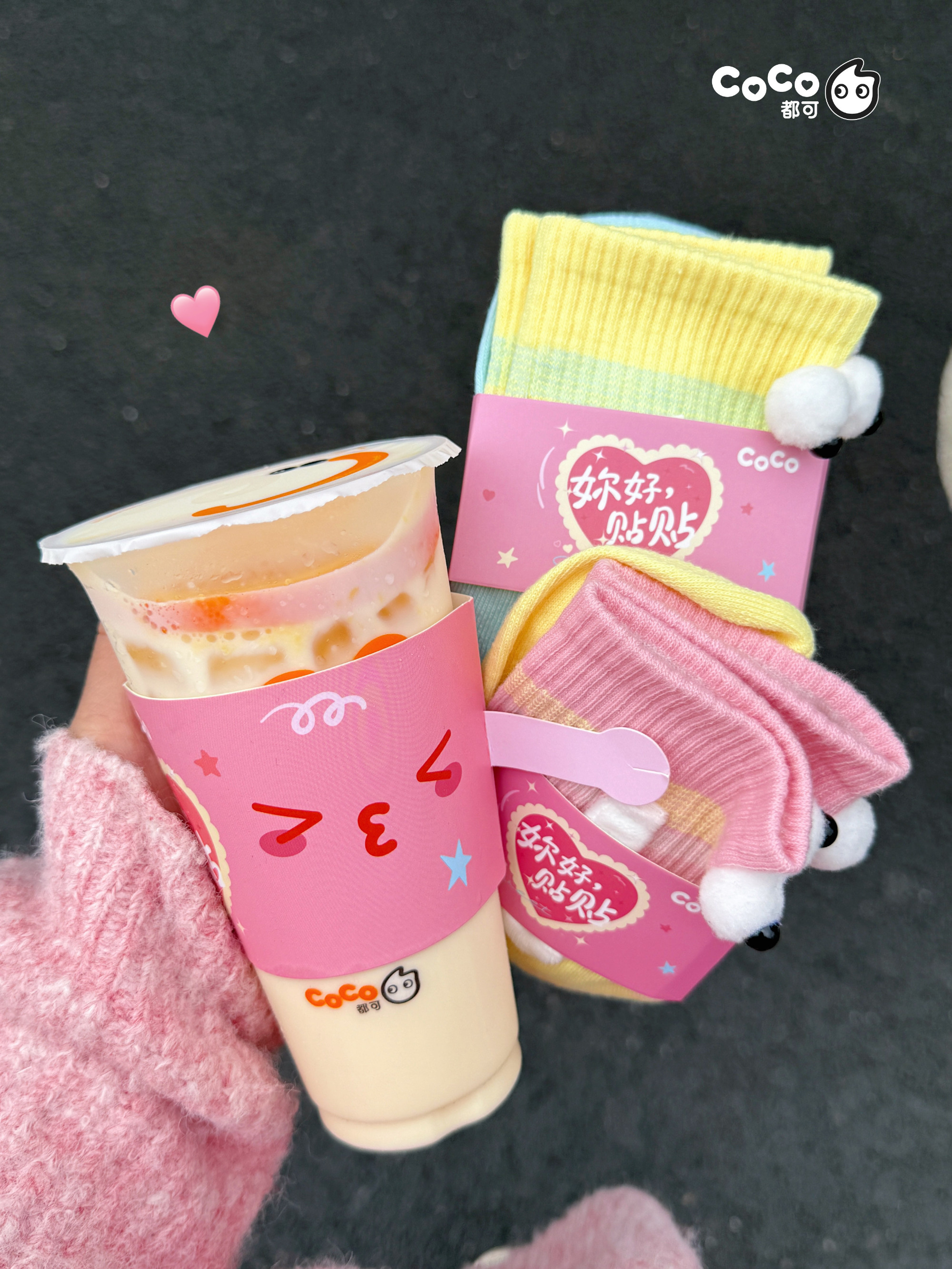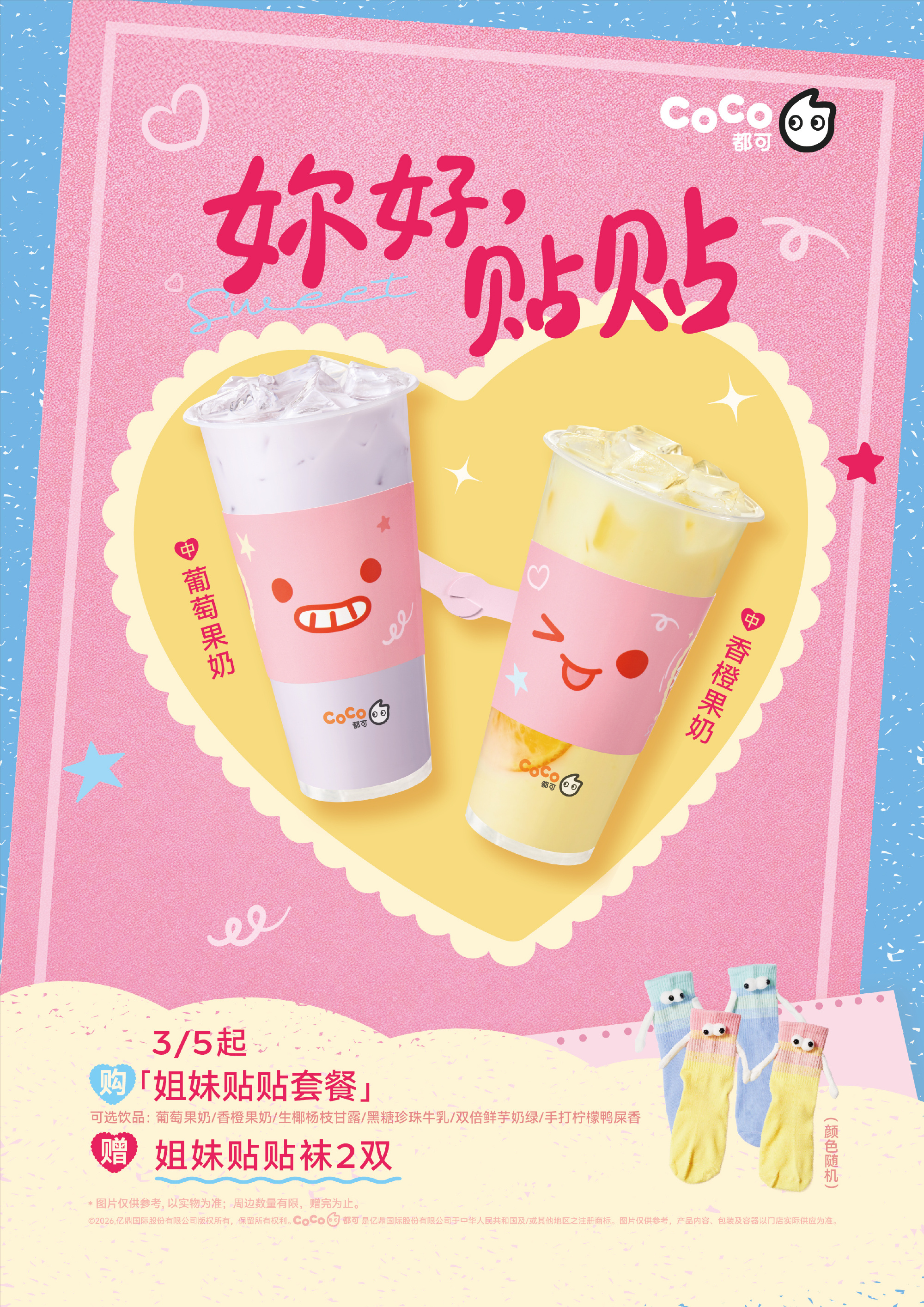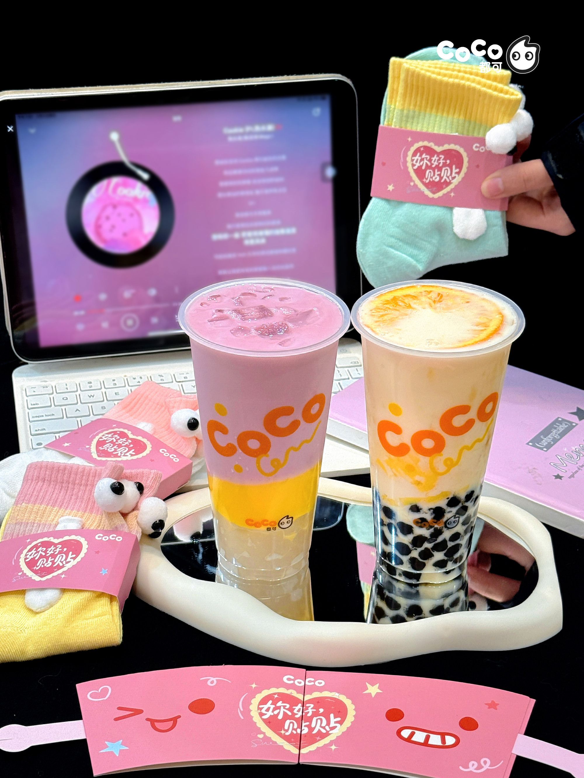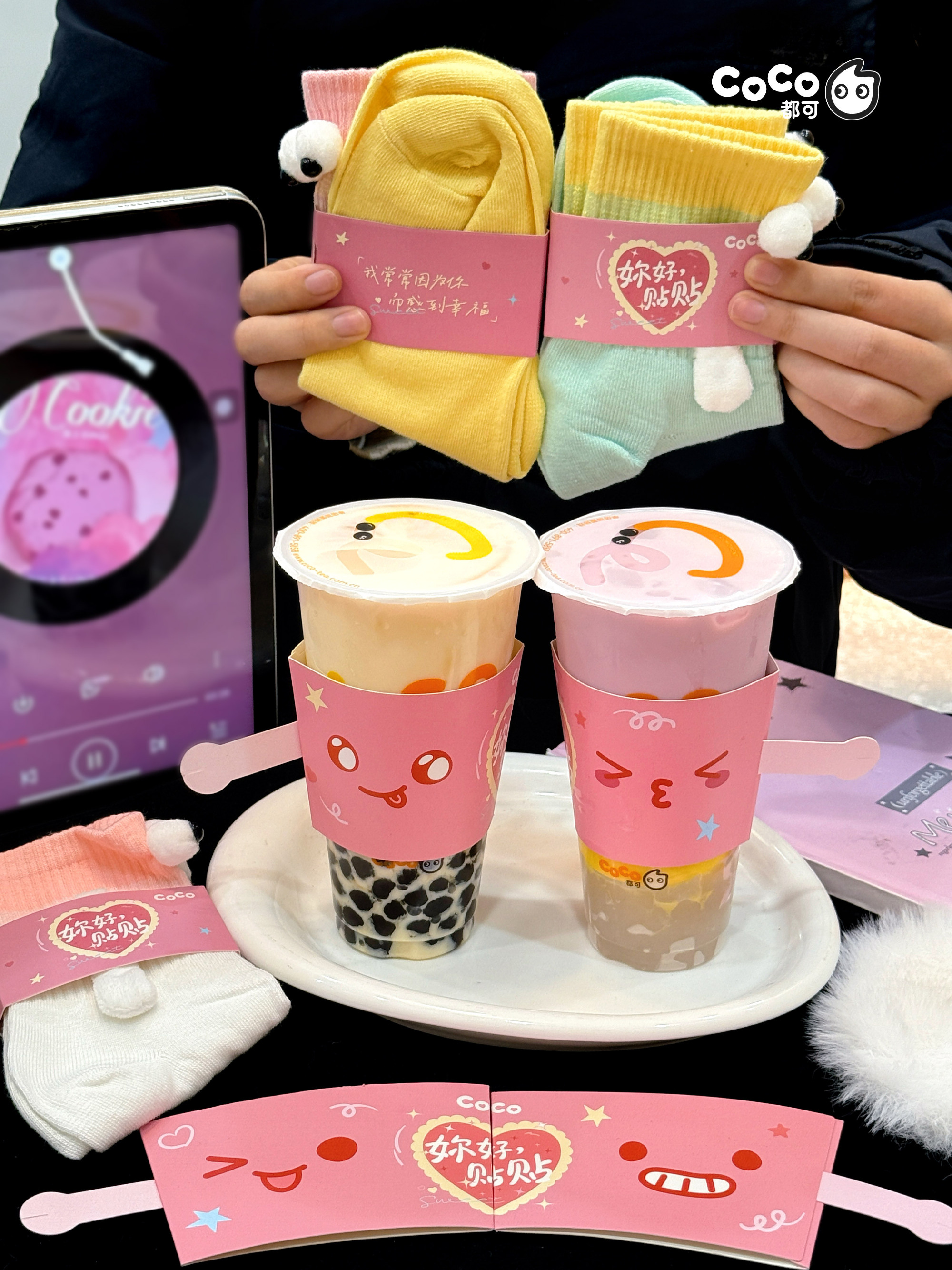 本次 CoCo 都可推出的「姐妹贴贴套餐」中,可在香橙果奶、葡萄果奶、双倍鲜芋奶绿、黑糖珍珠牛乳等 6 款人气饮品中任选 2 款,并附赠专属定制的 2 个可牵手的「贴贴杯套」,以及 2 双「姐妹贴贴袜」。