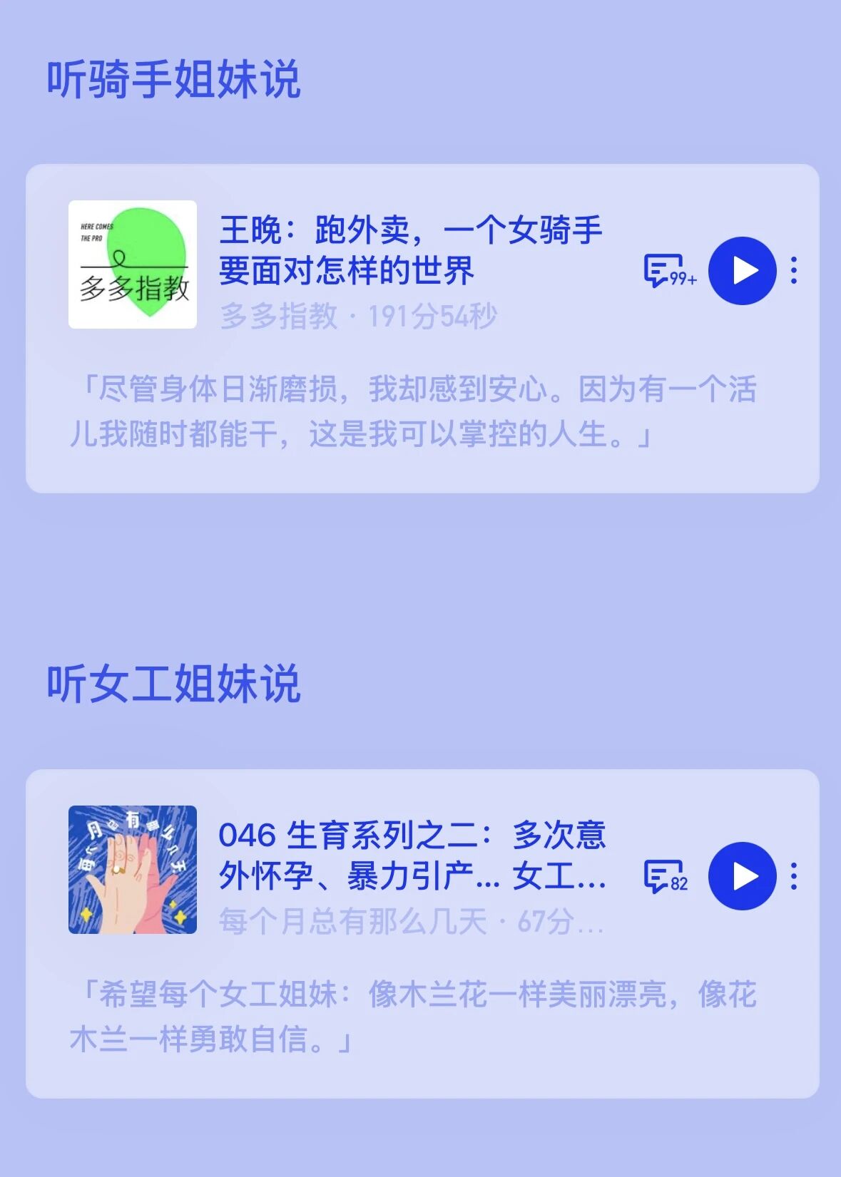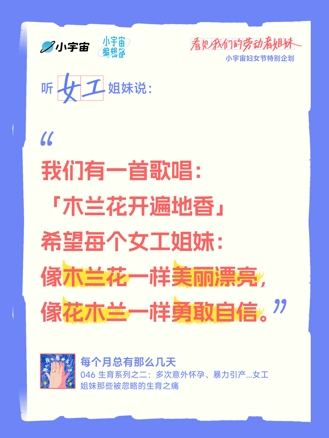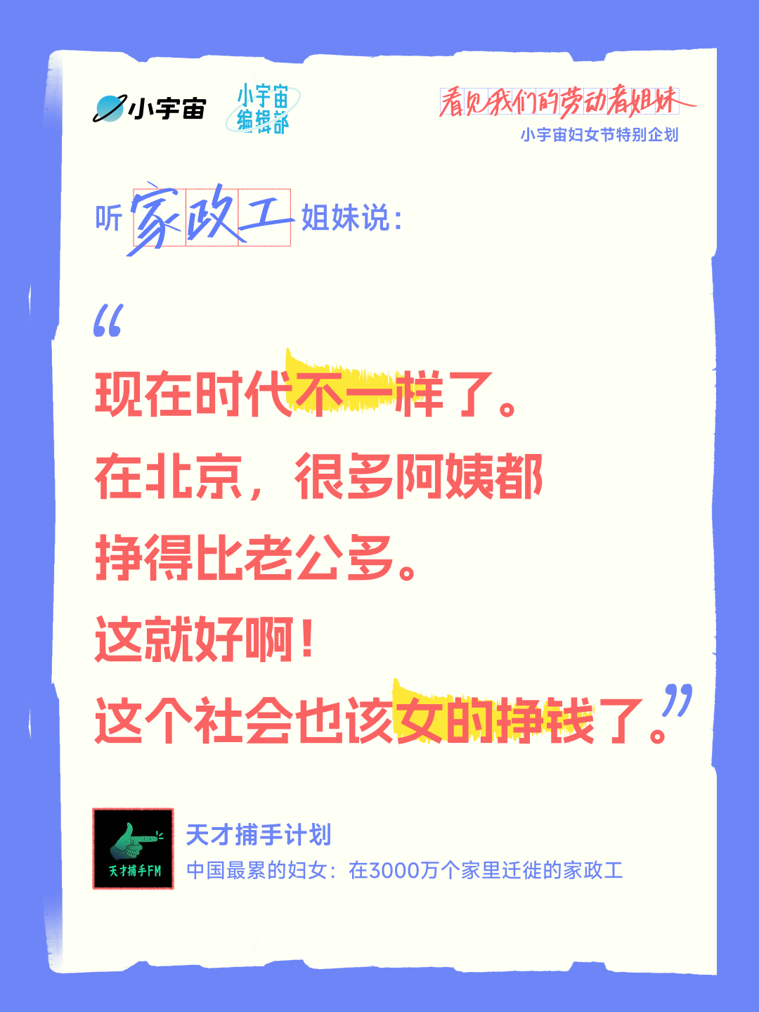 播客内容中,家政工姐妹坦言「现在时代不一样了,很多阿姨挣得比老公多」,道出女性经济独立的底气;女骑手分享自己从被凝视、被嘲笑到熟练接单的成长历程,直言「有一份随时能做的活儿,是我可以掌控的人生」;清洁女工画家诉说「不想一辈子死死打一份工」,用画笔安放情绪、追寻自由;女工姐妹唱响「木兰花开遍地香」,传递对勇敢自信的美好期许;零工姐妹则直面自身痛苦,探寻女性困境的根源,展现女性意识的萌芽与觉醒。此外,企划还关注到农村主播姐妹、县城女性劳动者等群体,呈现她们在鸡零狗碎的生活中坚守热爱、实现自我的故事。