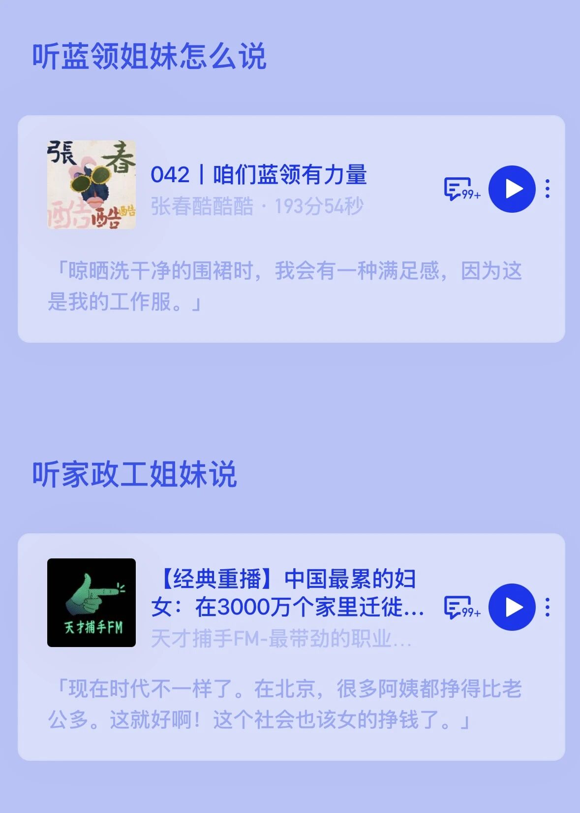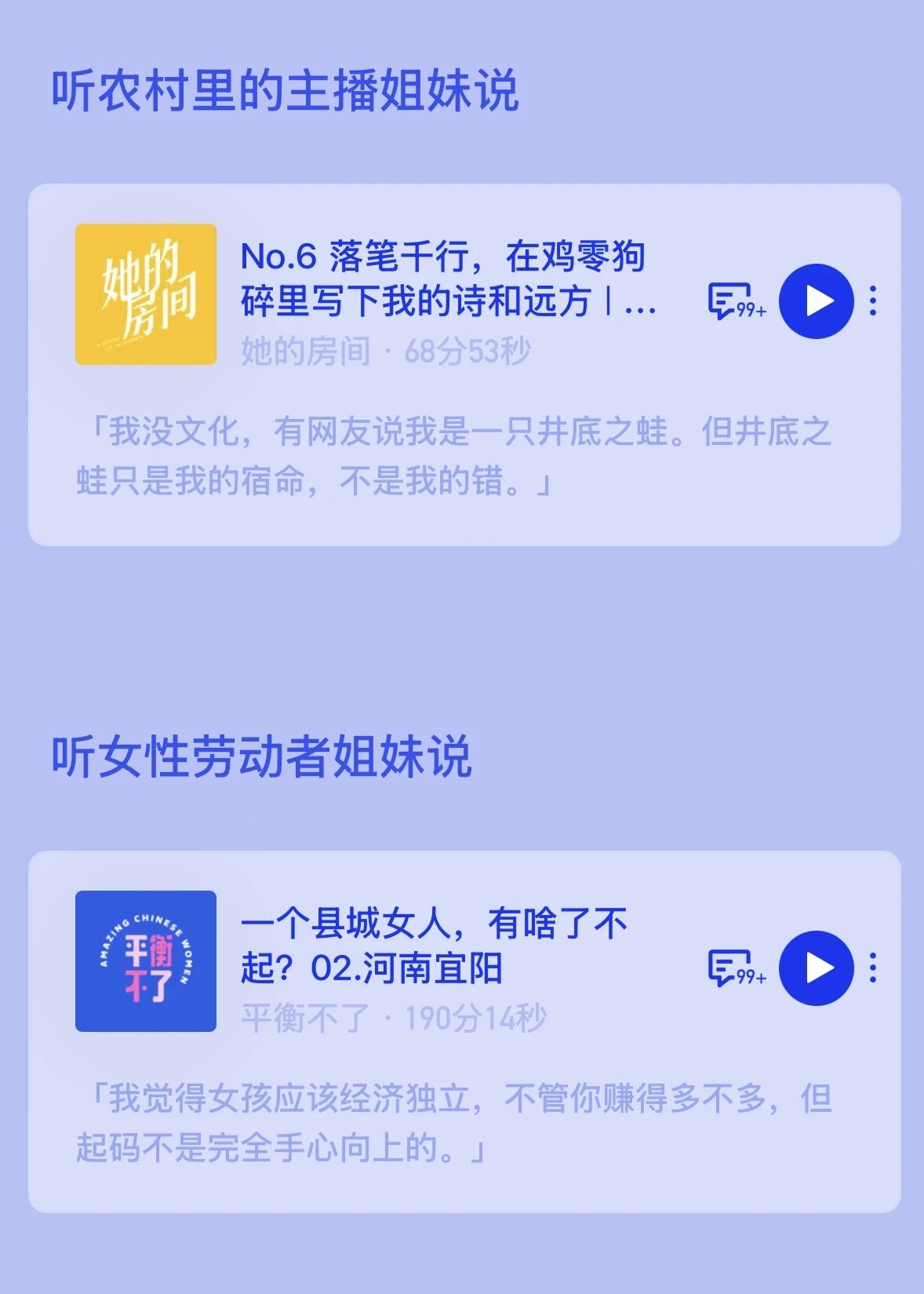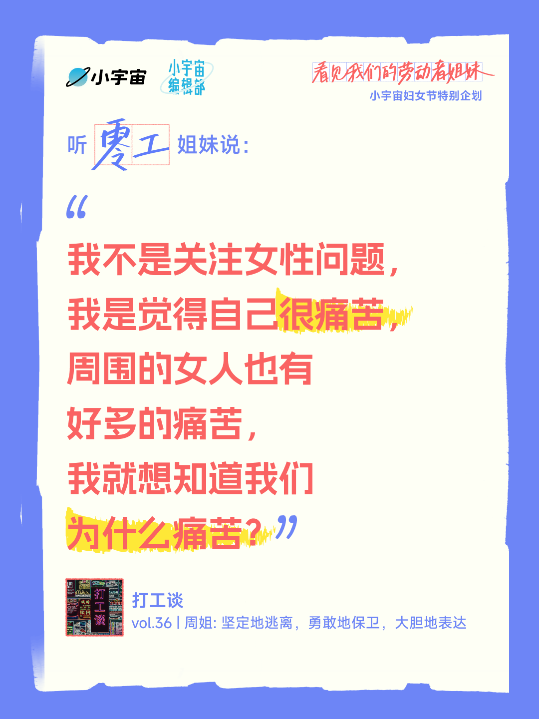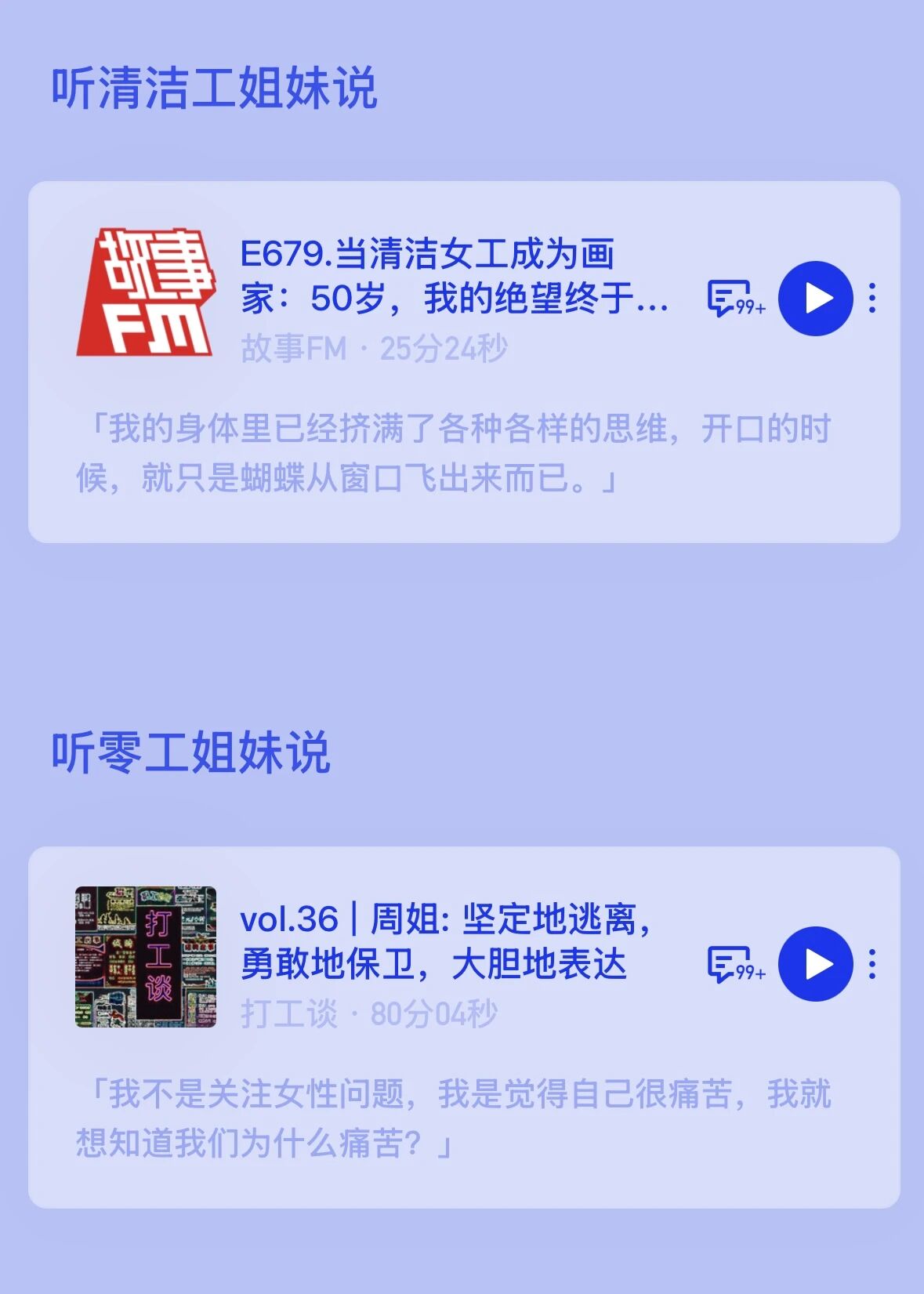 播客内容中,家政工姐妹坦言「现在时代不一样了,很多阿姨挣得比老公多」,道出女性经济独立的底气;女骑手分享自己从被凝视、被嘲笑到熟练接单的成长历程,直言「有一份随时能做的活儿,是我可以掌控的人生」;清洁女工画家诉说「不想一辈子死死打一份工」,用画笔安放情绪、追寻自由;女工姐妹唱响「木兰花开遍地香」,传递对勇敢自信的美好期许;零工姐妹则直面自身痛苦,探寻女性困境的根源,展现女性意识的萌芽与觉醒。此外,企划还关注到农村主播姐妹、县城女性劳动者等群体,呈现她们在鸡零狗碎的生活中坚守热爱、实现自我的故事。