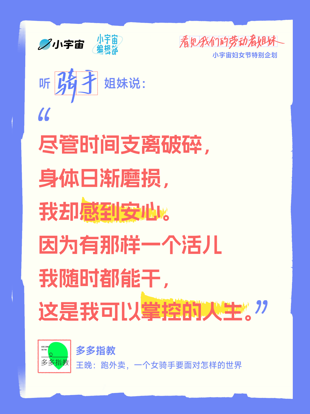 为此,平台联合八档共同发力,覆盖蓝领姐妹、骑手姐妹、女工姐妹、零工姐妹、家政工姐妹等多个群体,通过第一视角访谈,还原她们的工作日常、生存困境与内心坚守。