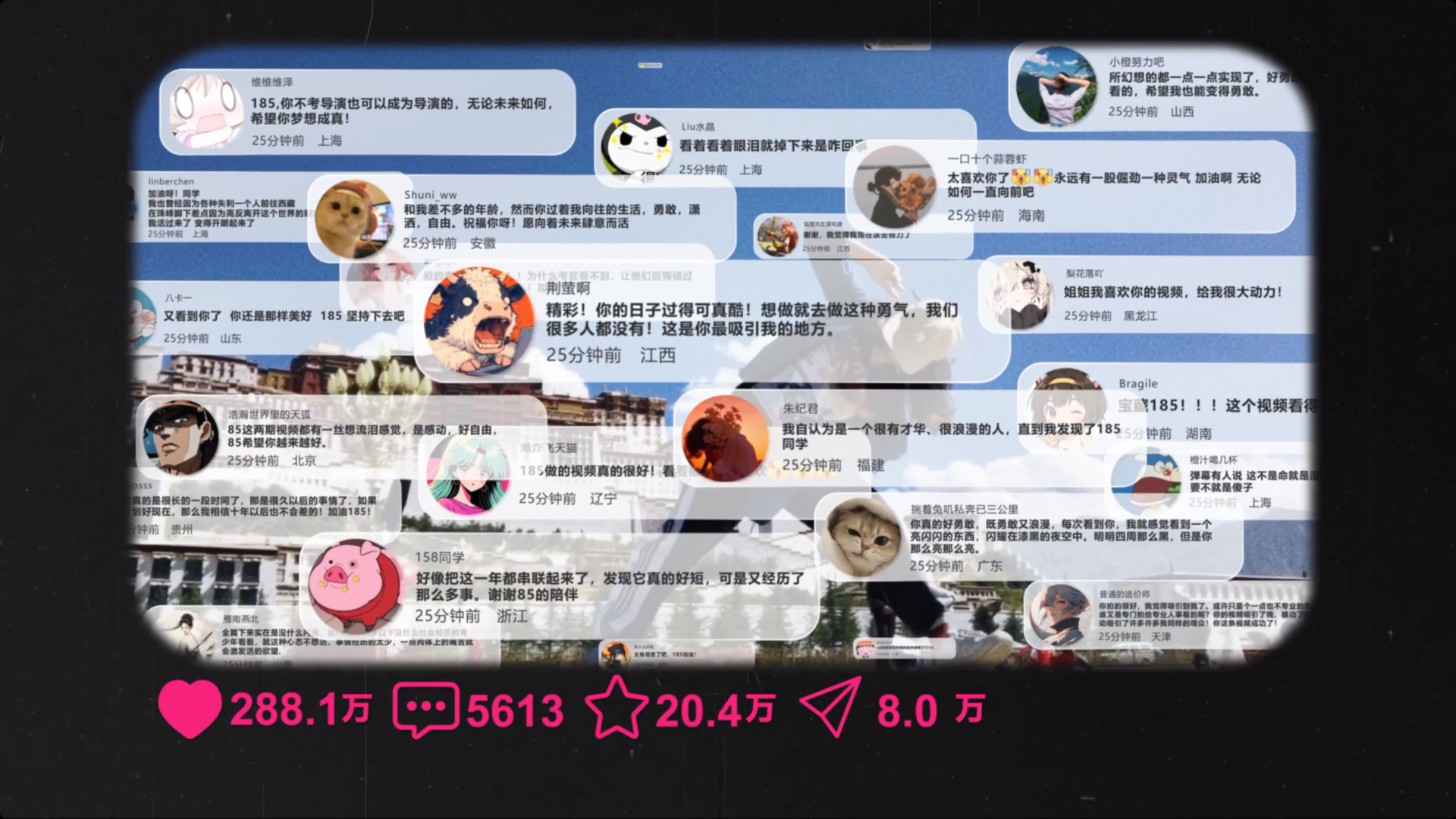 作为一个有导演梦的女孩,185 同学从小的愿望就是考上期望院校的导演系,但反复高考了 3 次都未能如愿,就当她以为一生都无法圆梦之时,一条记录自己在西藏 31 小时的短片突然火了,在互联网上收获了不少网友的点赞。不仅如此她拍摄的关于失恋的短片也获得了 FIRST 影展的奖项,如今她虽然没有考上导演系,却已经成为了一个真正的导演。