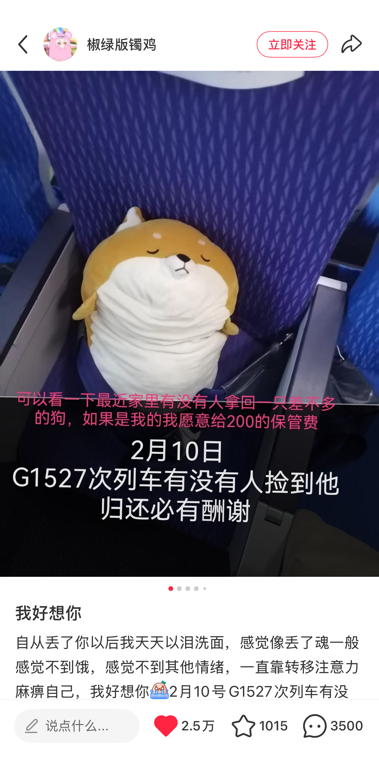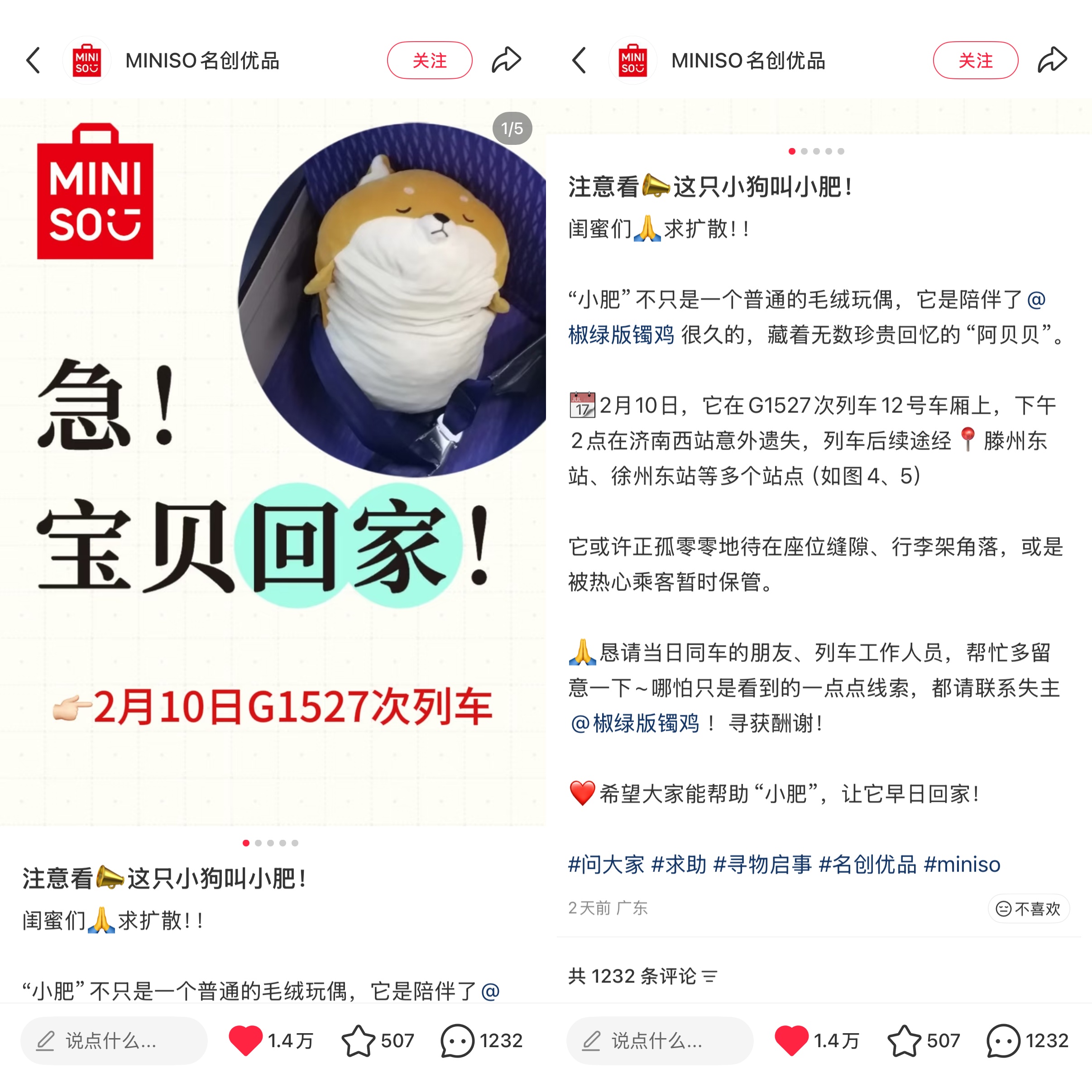 这只柴犬造型的玩偶,其实是名创优品在几年前推出的趴姿公仔,刷到这条帖子的名创优品也是相当仁义,直接在官号上为网友发布了一条帖子,详细列举了高铁经过的站点以及玩偶特征,助力「宝贝回家」。