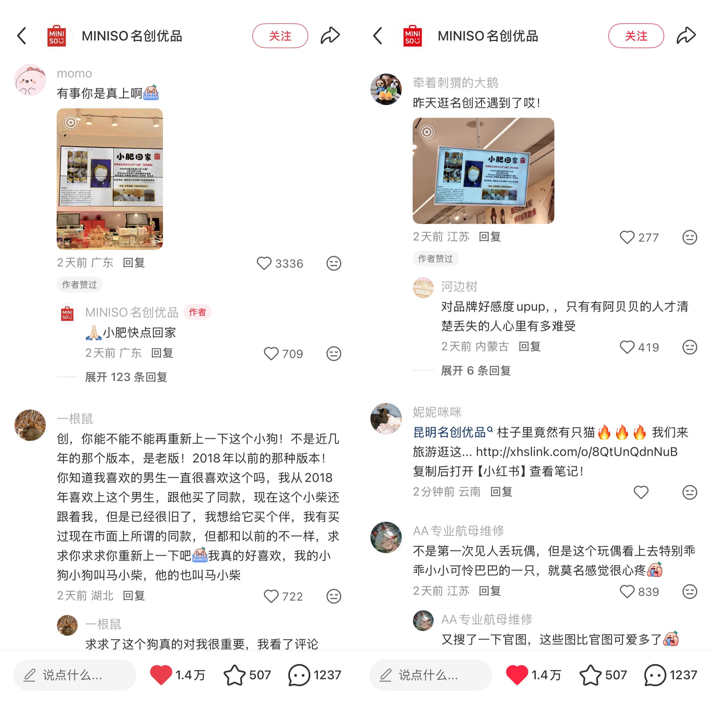 不仅如此,还有网友偶遇名创优品在线下门店的大屏上紧急播放寻狗启事,让走过路过的消费者都能留意到这则信息,增加找到小肥的可能性。