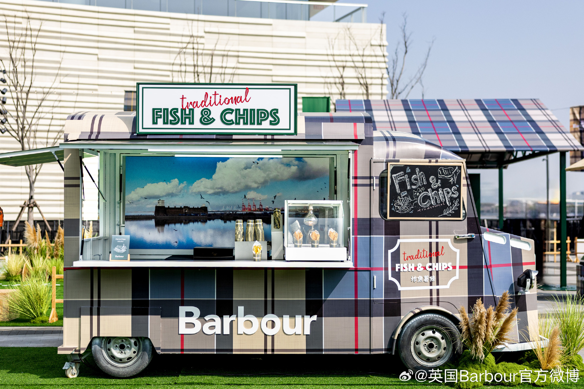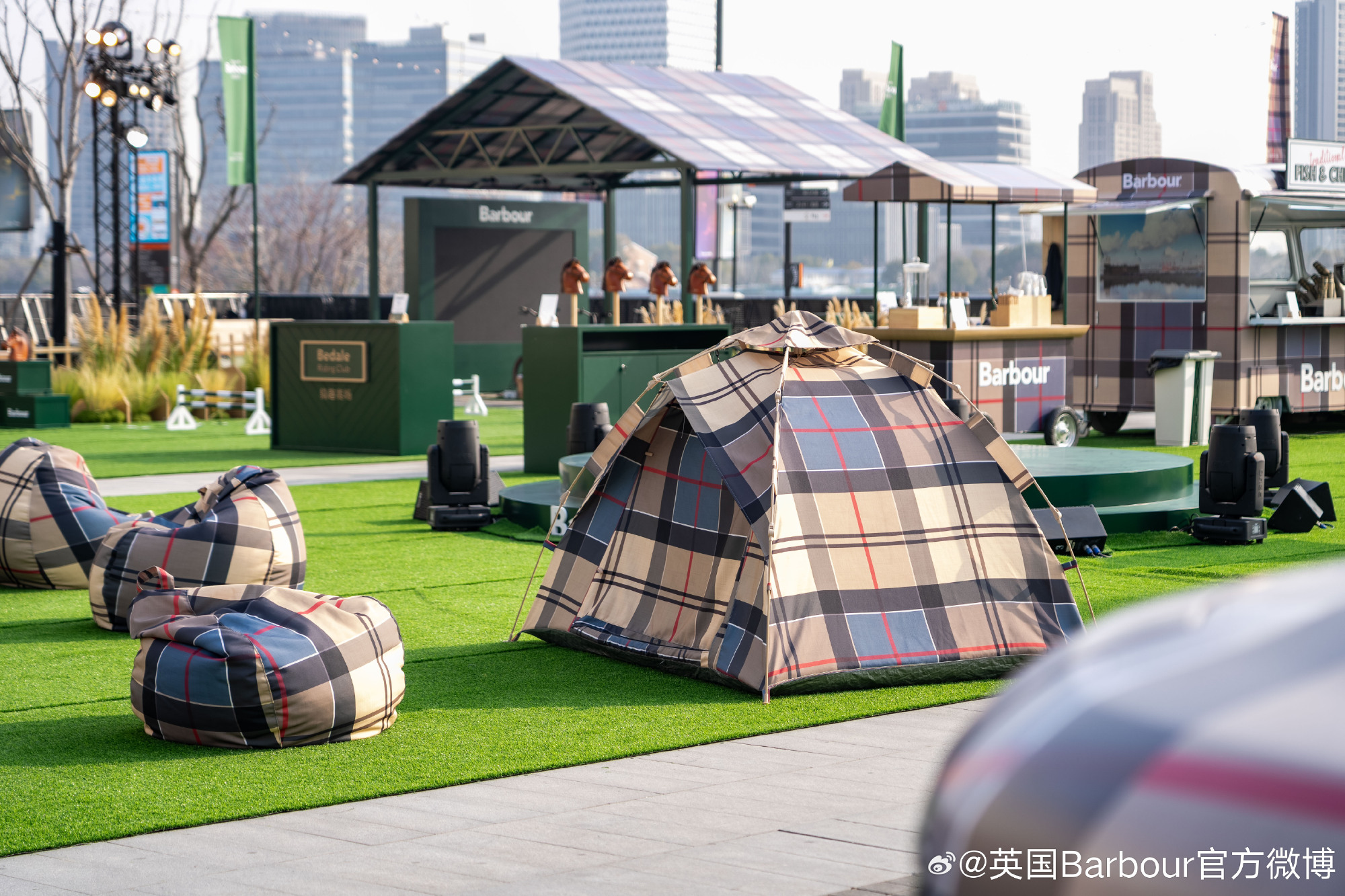 Barbour 标志性的 Dress Tartan 格纹与经典 ICONS 系列夹克作为核心元素,巧妙融入各处场景,呈现品牌的生活美学。