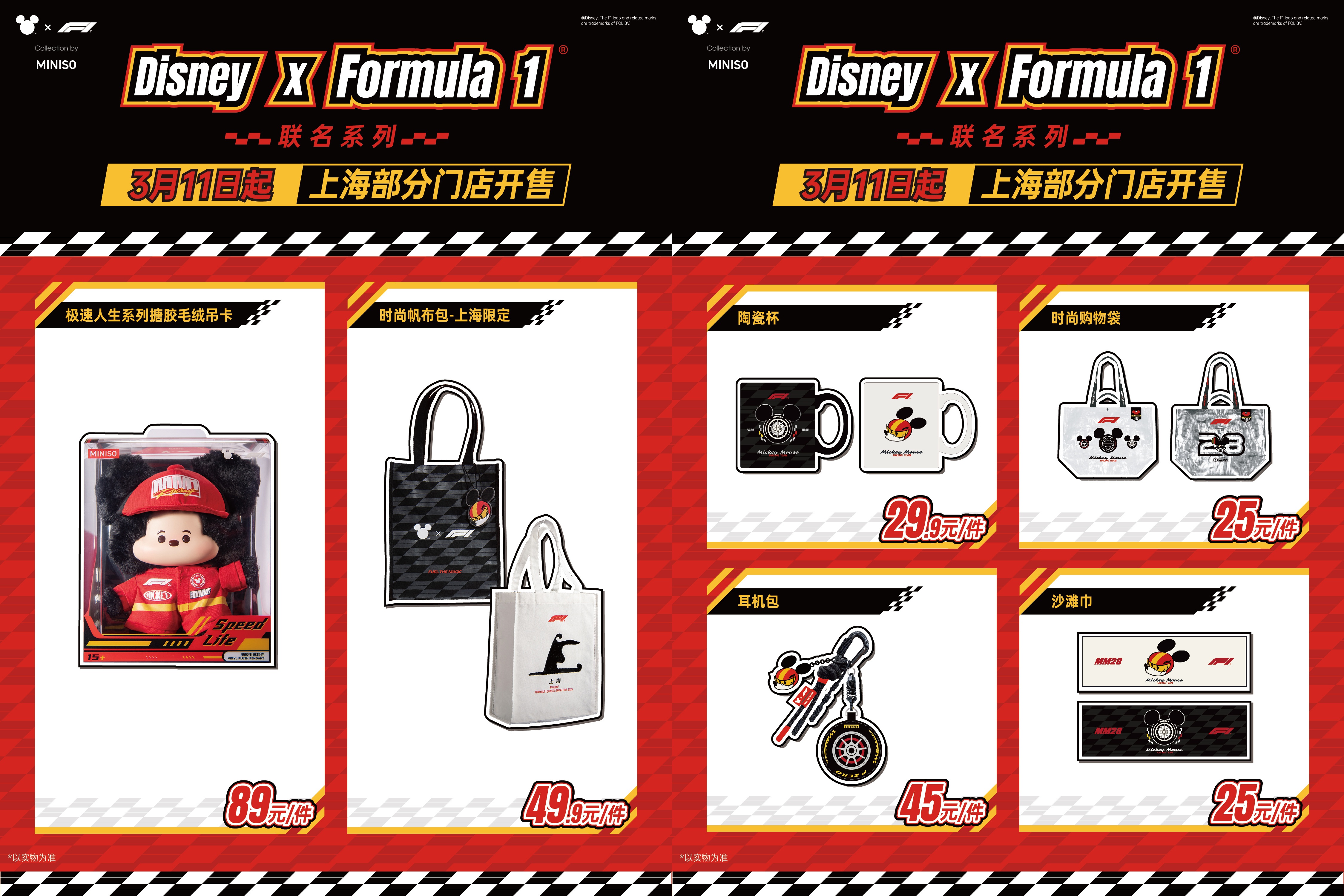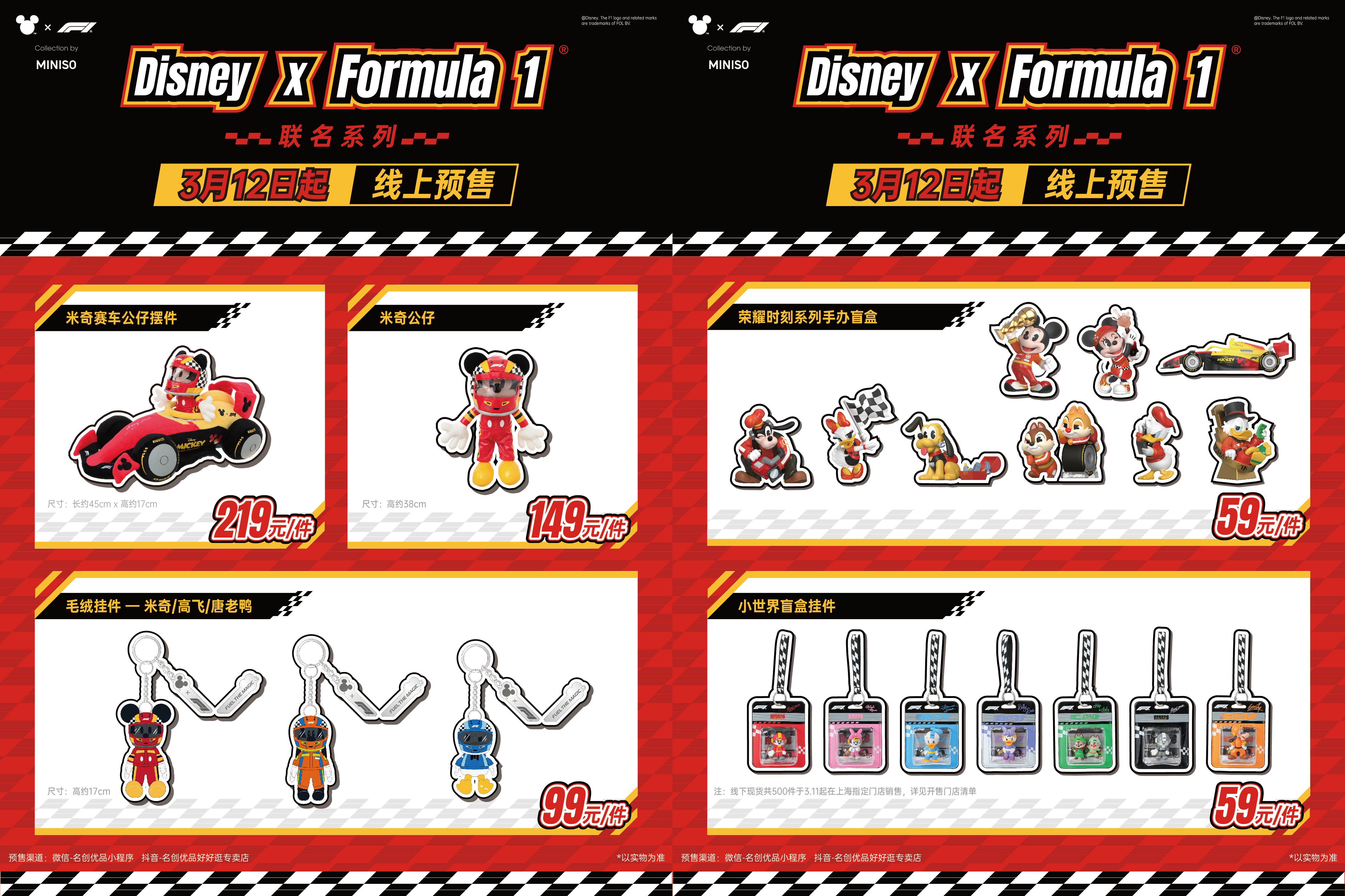 此次联名,名创优品带来了搪胶毛绒、帆布包、陶瓷杯、手办盲盒、公仔挂件等多品类商品,涵盖消费者的生活多场景需求。米奇和朋友们一起换上全新赛车服,以前卫时尚的造型演绎对赛车的无限热爱。3 月 11 日起,部分产品于上海 14 家门店线下首发,全国其他门店陆续开售;3 月 12 日起部分产品线上开售,部分潮玩品类线上预售开启。