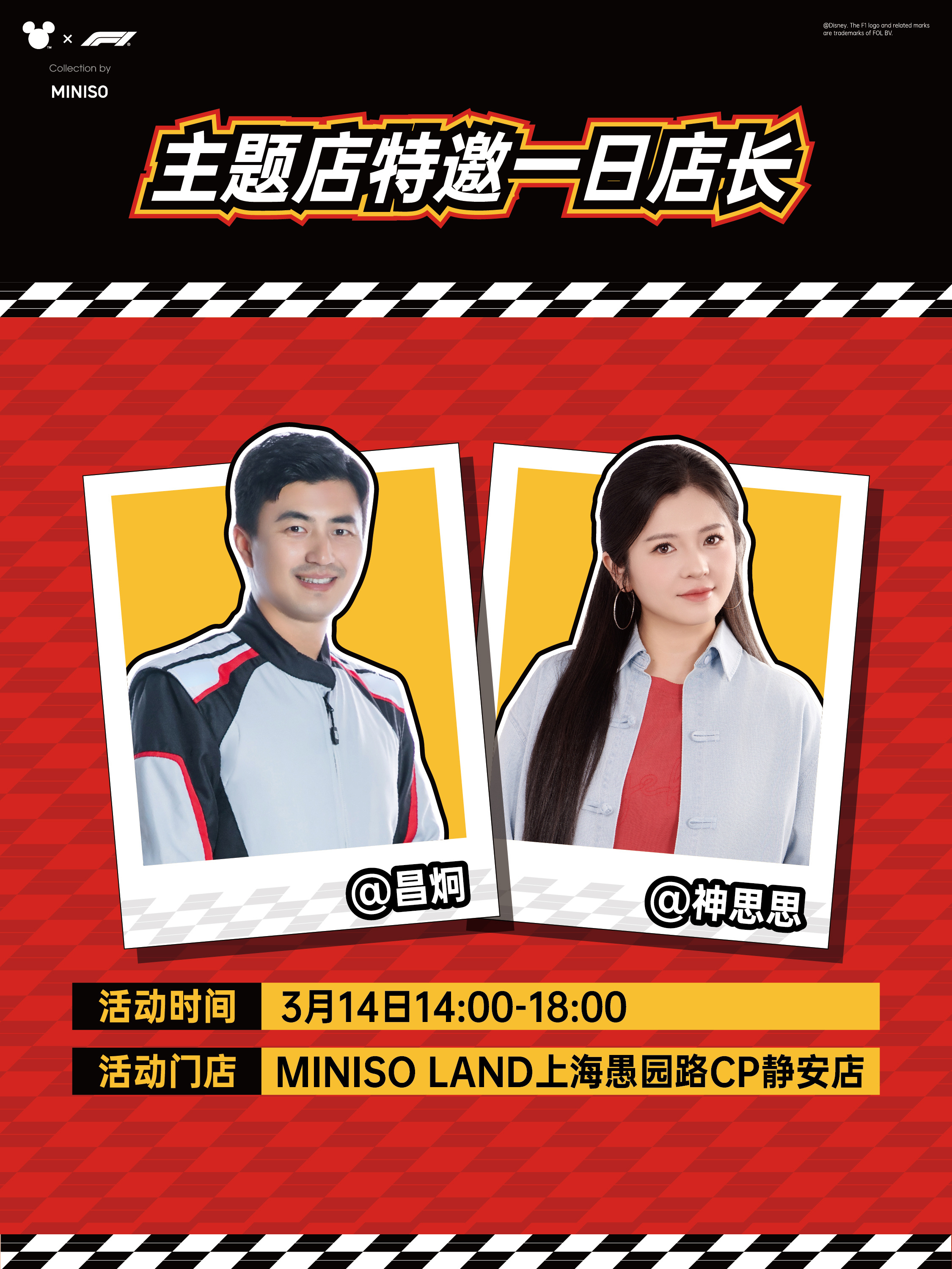 MINISO LAND 上海愚园路 CP 静安店成为此次 Disney x Formula 1® 联名系列的主题店,于 3 月 13 日正式上线,欢迎消费者前来打卡定格热血瞬间。3 月 14 日,品牌还邀请到@昌炯@神思思两位担任一日店长,作为 F1 观赛搭子与大家共同体验竞速乐趣。[SocialBeta]