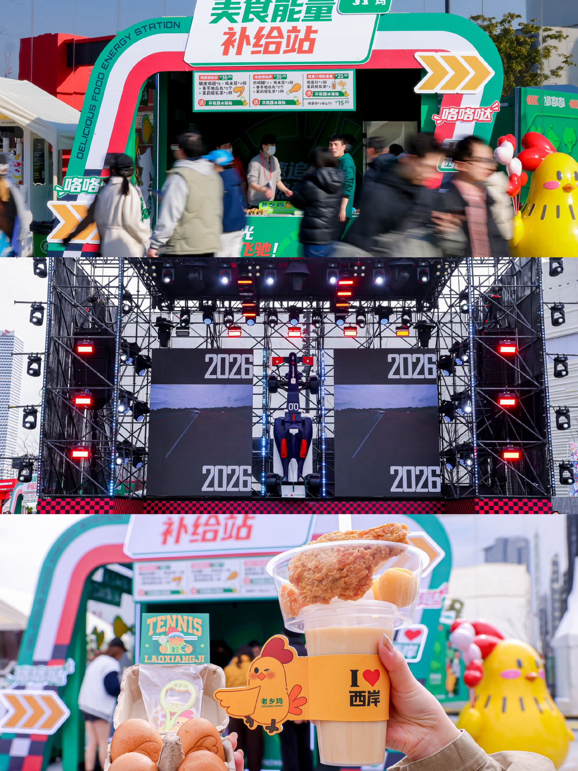 3 月 21 日至 23 日,F1 正赛现场老乡鸡直接进驻上海国际赛车场水景广场 A2 展位及 K 看台区域。在赛事最高潮时段,为观众提供即时能量补充,将品牌主打的「饱腹感」与「快速出餐」与「速度」、「激情」进行绑定。