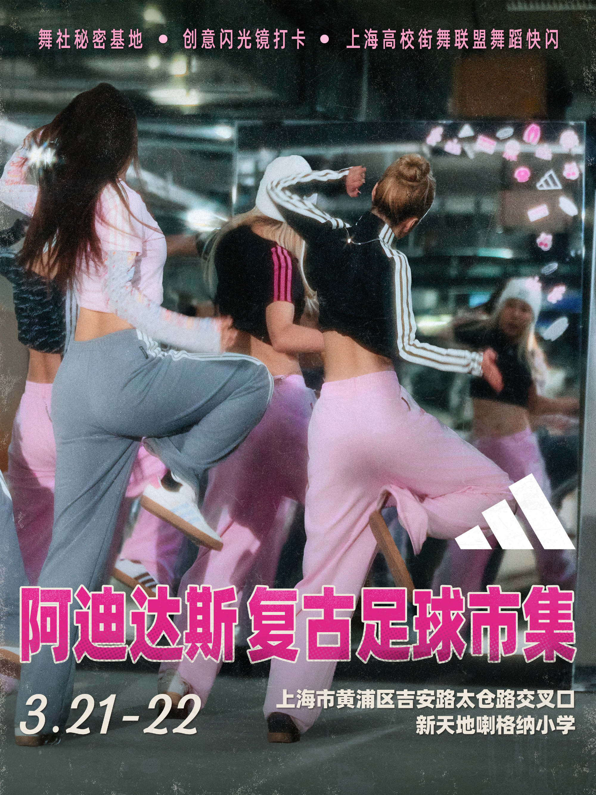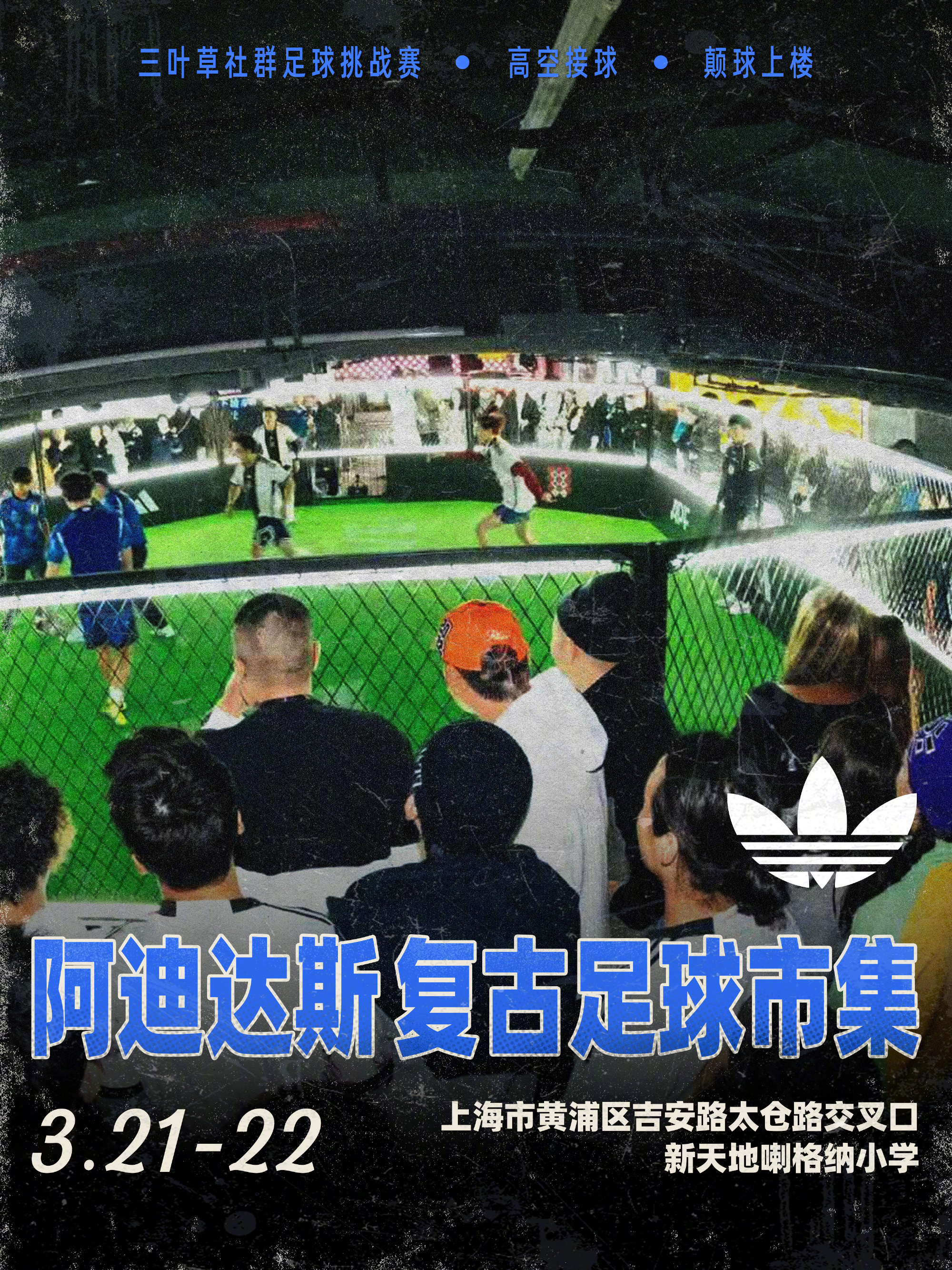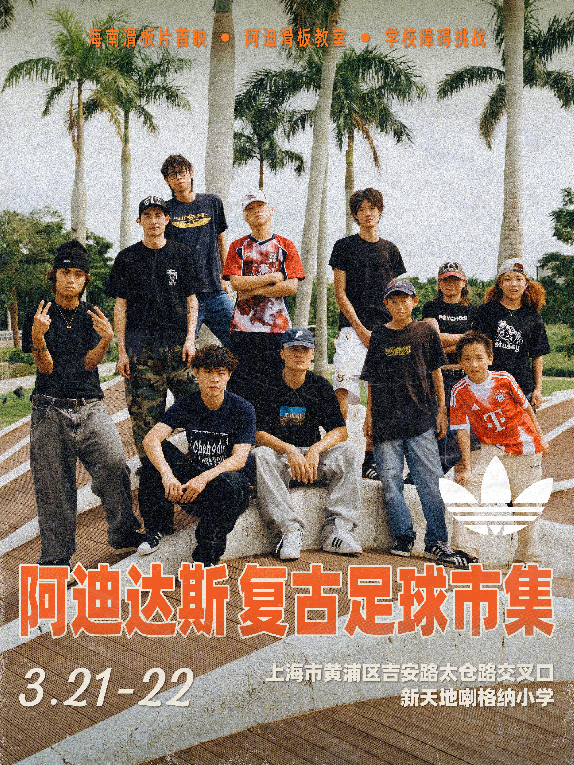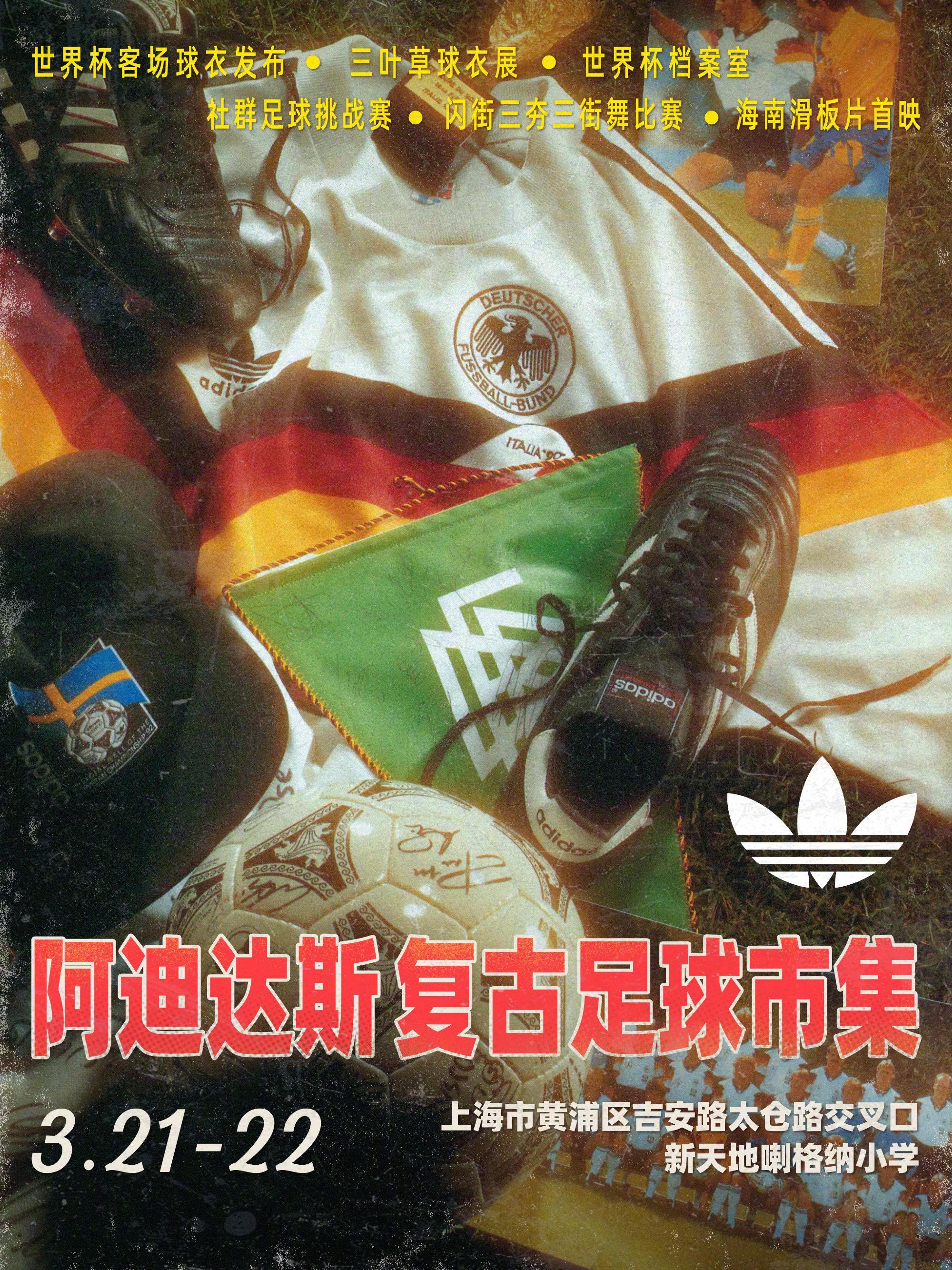 围绕足球本身,adidas Originals 也安排了多项互动环节。三叶草社群足球挑战赛将在操场展开,高空接球、颠球上楼等趣味项目,让人在轻松的节奏中找回校园时代踢球时的感觉。另一边,街头文化同样成为现场的一部分,闪街三夯三街舞比赛、舞社快闪和创意闪光镜打卡点分布在校园各处。入夜之后,现场还会首映滑板影片,为这场凝聚街头文化与足球记忆的市集画上句号。
