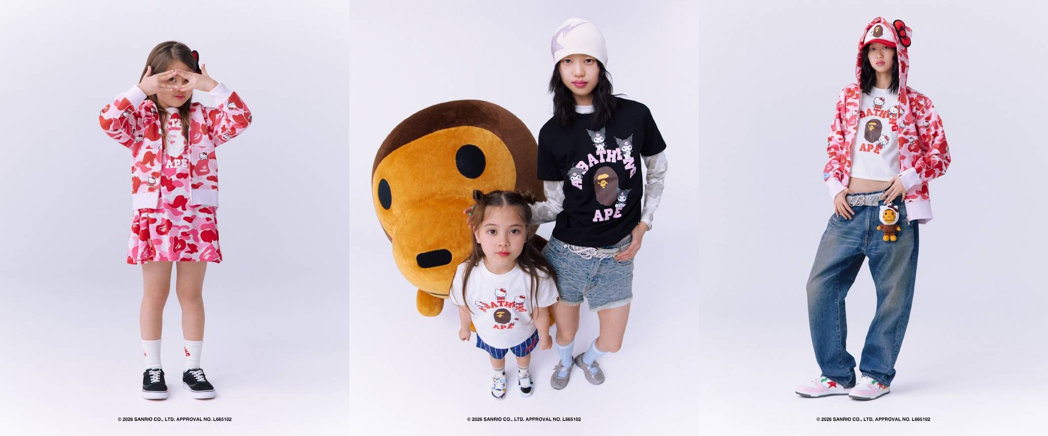 系列专属原创印花暗藏巧思,将两位三丽鸥明星的身影隐匿于 BAPE 经典的猿人头与迷彩元素之中,带来充满想象力的视觉探索乐趣,标志性的 APE HEAD 被创意性地戴上了 HELLO KITTY 与 KUROMI 的角色头套,萌趣十足又不失街头态度。产品线覆盖女装与童装,包括鲨鱼拉链帽衫、短袖T恤、网眼帽以及毛绒公仔钥匙扣等个性单品,满足全年龄层潮流爱好者的收藏需求。