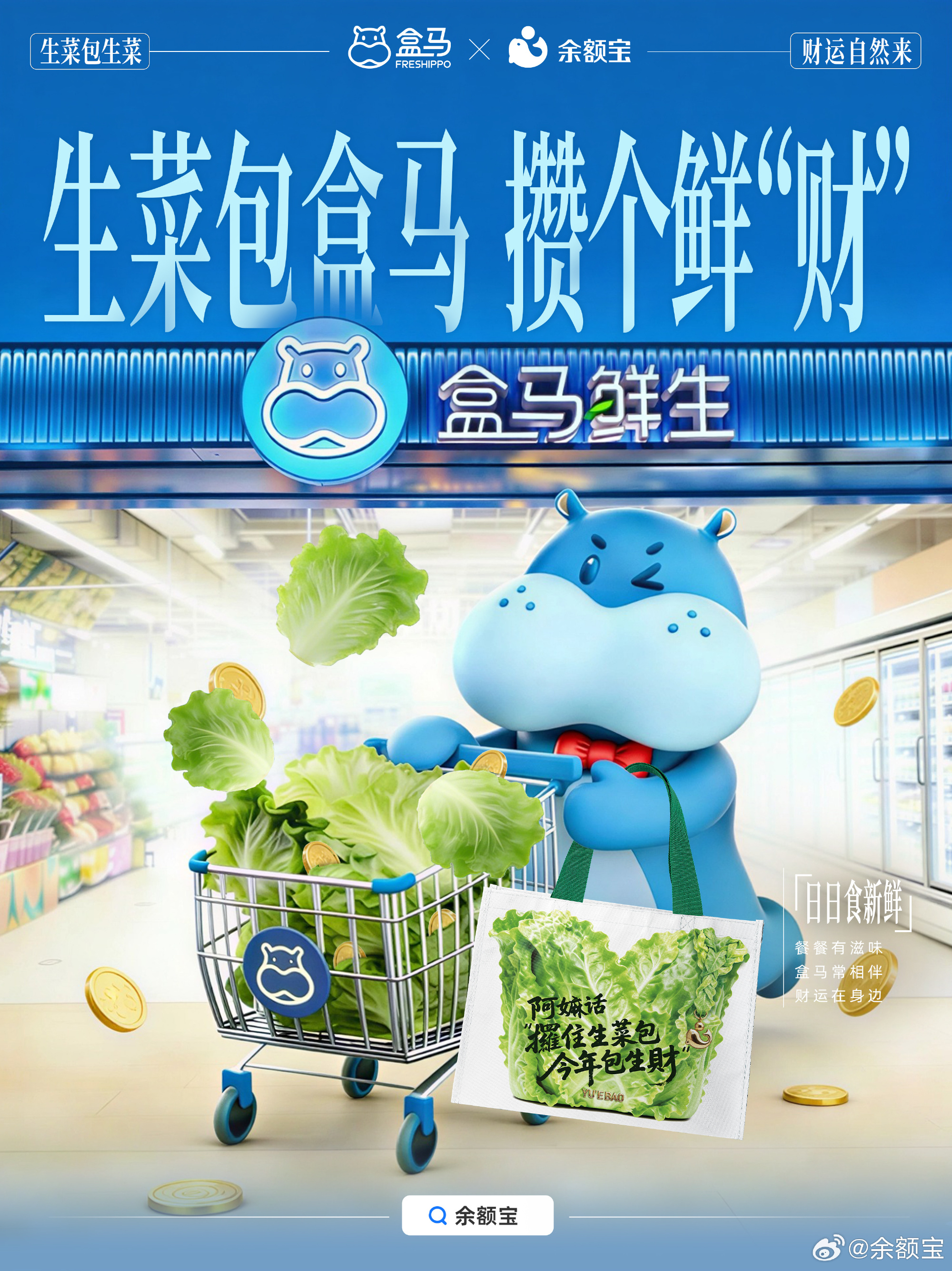 除了线上广告,余额宝与仁科的联动更延伸至线下场景。活动期间,余额宝面向全国用户免费派发 1 万颗盒马新鲜生菜,搭配「一路生财」生菜包、「遇水生财」生菜伞等创意周边,进一步强化联动记忆点。