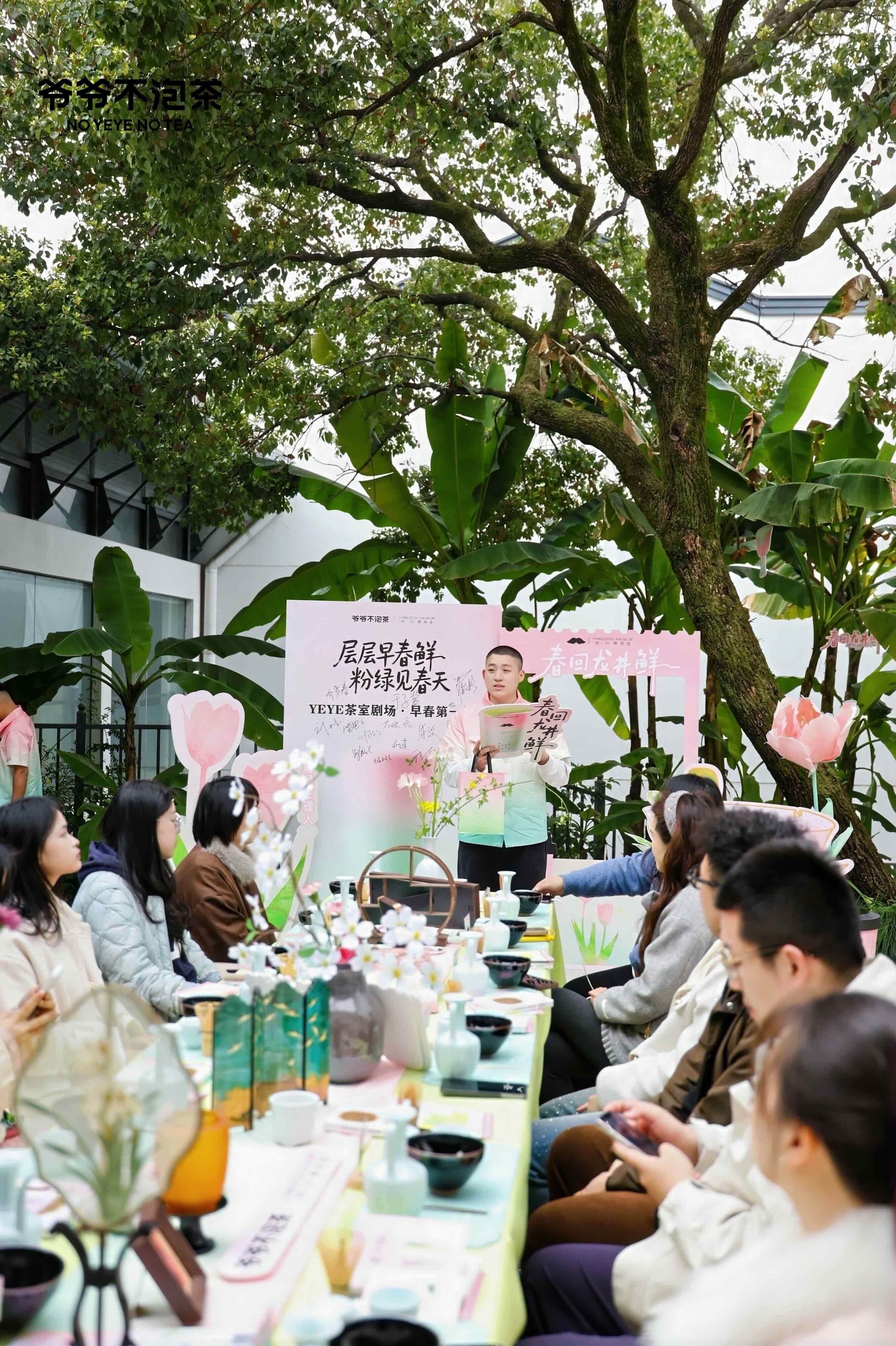 产品之外,爷爷不泡茶也在线下打造了花式活动。3 月 19 日,杭州博物馆内开启「YEYE 茶室・早春第一杯品鉴会」,从宋式点茶活动、陶瓷 DIY 到闻香猜茶,中国传统文化的雅致与趣味,以一种鲜活的方式被体验。3 月 20 日,爷爷不泡茶还在杭州玉鸟集举办春日快闪,打造出一个茶香与春光交相呼应的江南茶空间。全国各打主题门店也同步上新,等待消费者前往打卡品茶。
