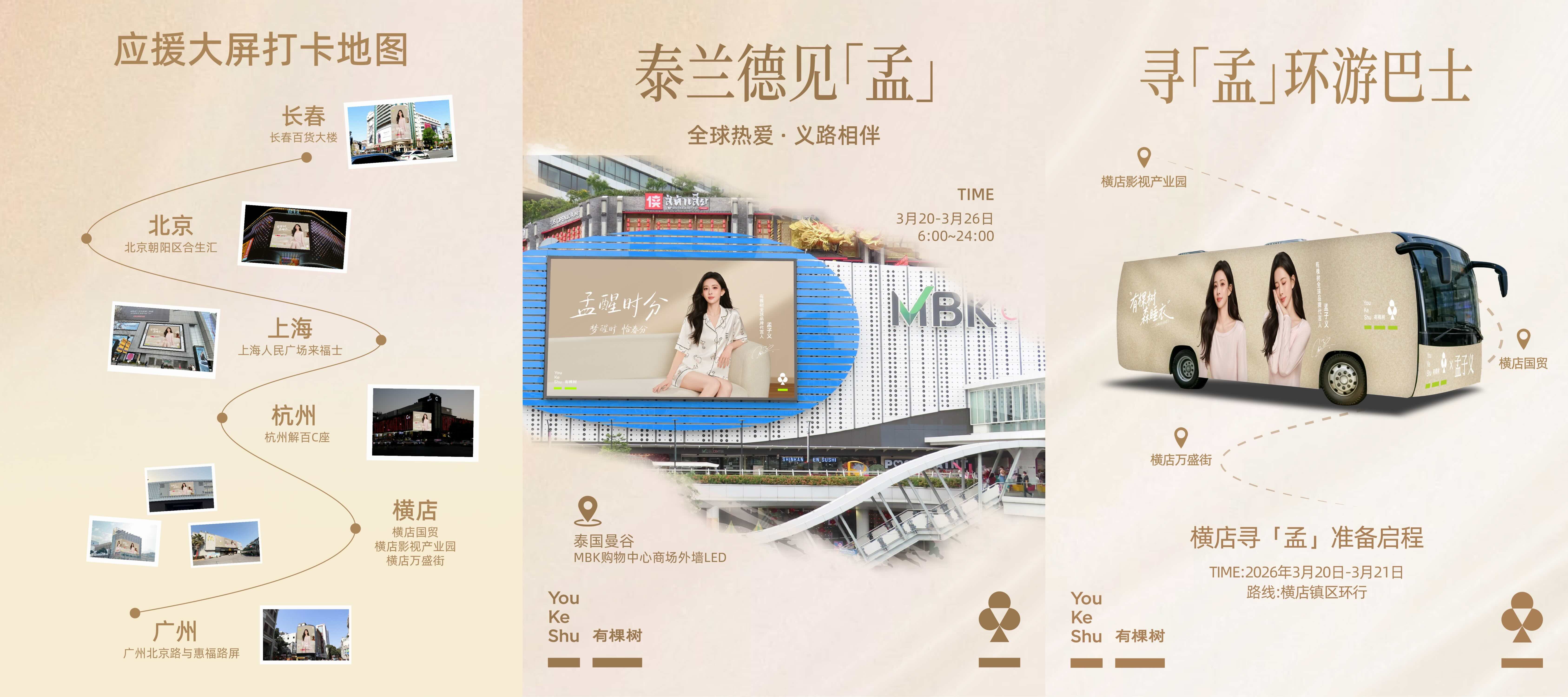 与此同时,有棵树带来多款「孟醒时分」系列周边,含发圈、小卡、日历牌等多款小物,祝大家都有美孟相伴,用户消费满额即可获得相应周边。线下,品牌则在全国六城打造应援大屏,从孟子义的家乡长春、求学之地北京,再到奔赴热爱的横店,粉丝参与打卡有机会获得亲签明信片;此外,有棵树还在泰国曼谷投放 LED,同时在横店开启寻「Meng」环游巴士,拉满官宣排面。