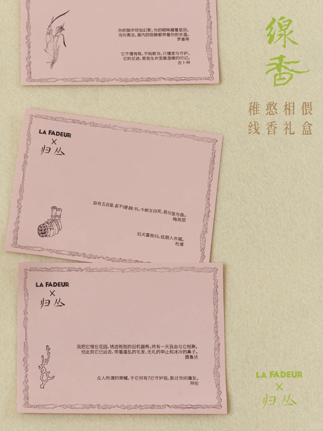 产品设计上,品牌以三种不同的气味回应人们对宠物的怀念:「兽为伴」讲述人与动物彼此陪伴、和谐共处的关系;「群草」融入艾草气息,寄托辟邪与安抚之意;「古寺暮窗」则借黄昏寺庙的意象,营造一种安静、诗意的追忆氛围。与此同时,品牌还将六段来自世界各地作家的诗歌藏入线香管内,让点香这一动作,成为一种跨越语言和国界的沟通仪式。