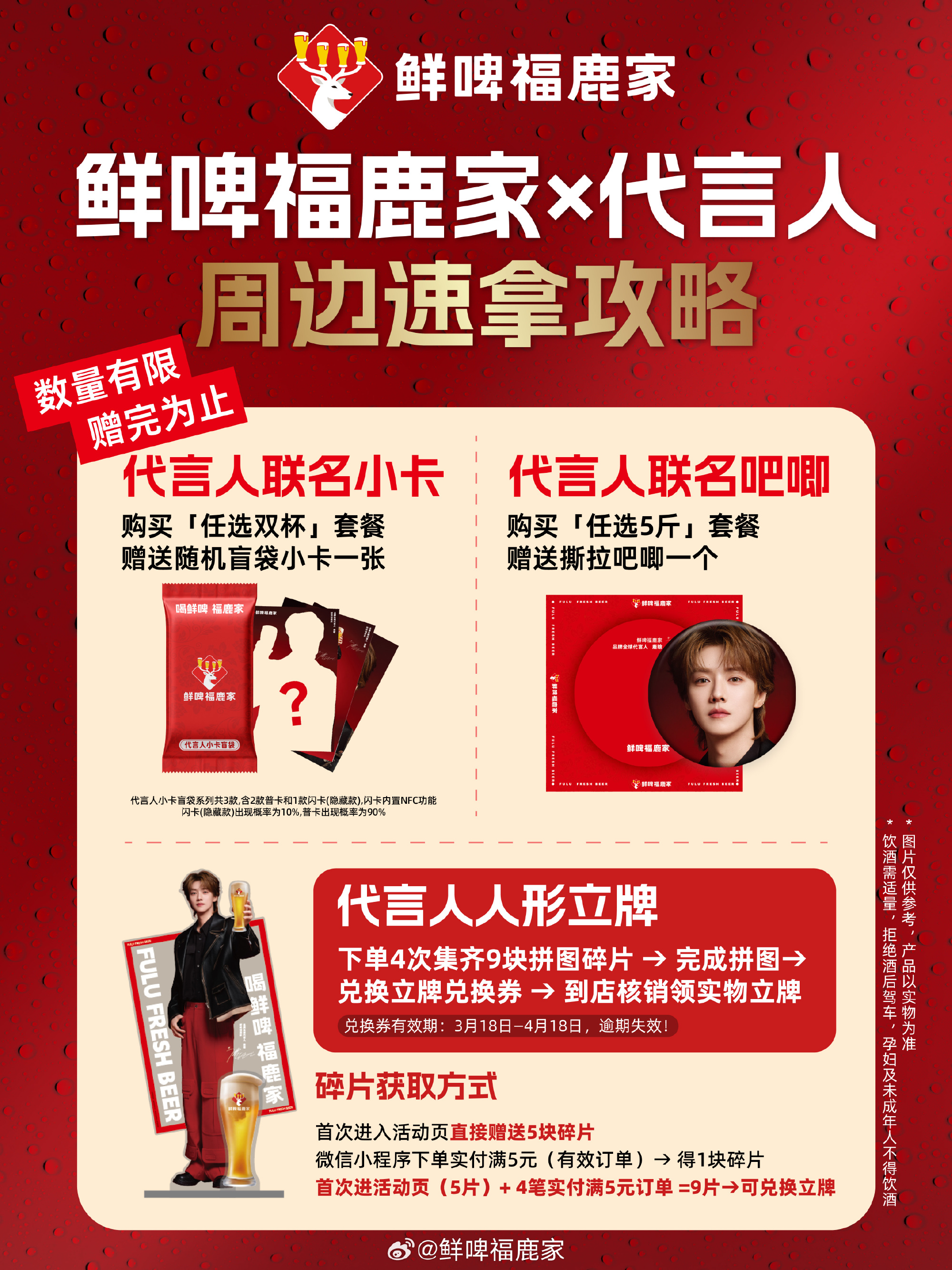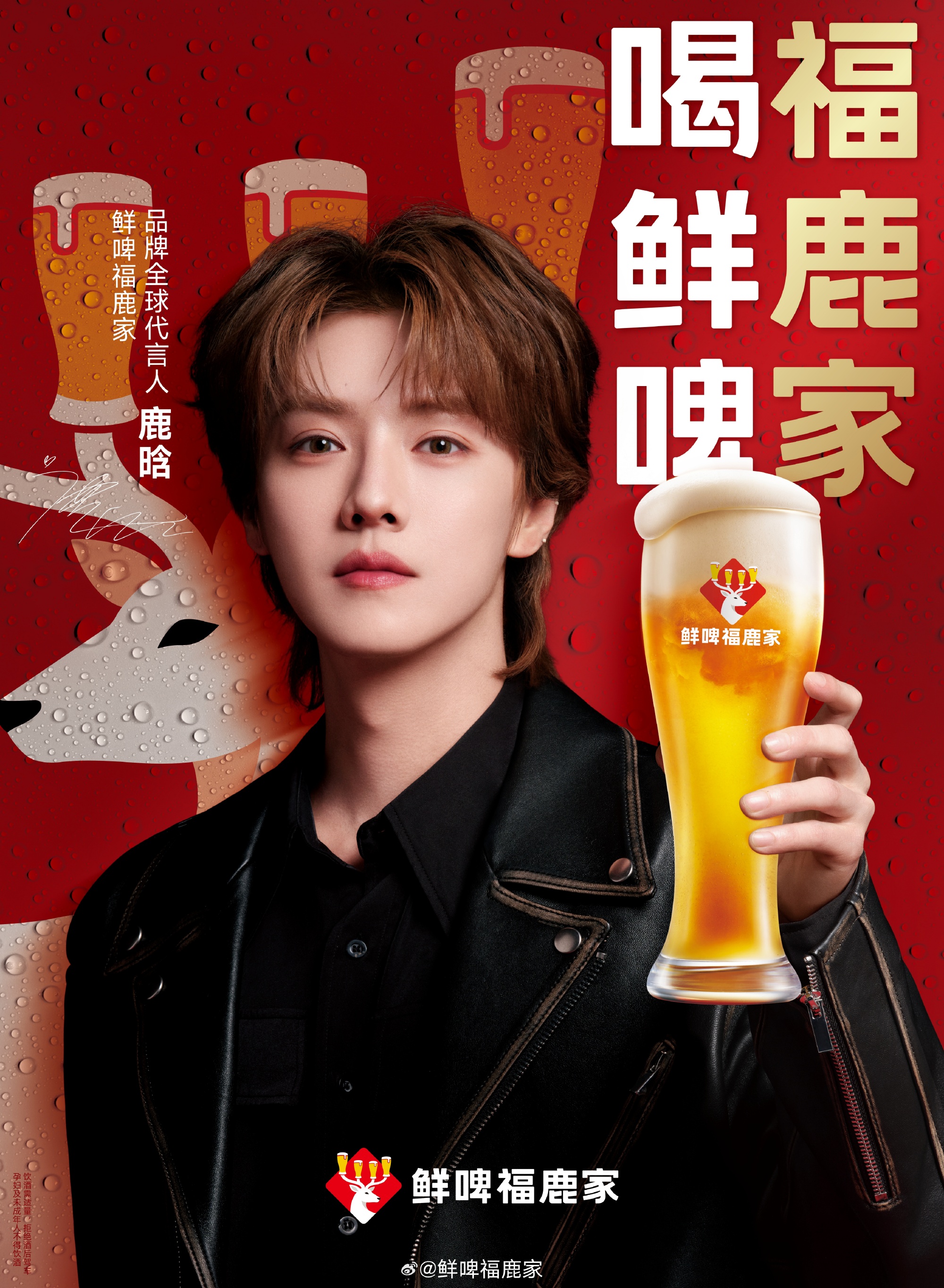 蜜雪冰城旗下鲜啤品牌福鹿家官宣鹿晗为全球代言人,此次合作主打「双鹿」概念,强调品牌年轻化与清爽特质。而品牌名中的「福鹿」与鹿晗的姓氏形成天然绑定,有着「福禄双全」的美好寓意。品牌官宣代言后热度迅速飙升,福鹿家同步推出了包含代言人小卡、盲袋及 NFC 联名闪卡的限定套餐,引发粉丝抢购。