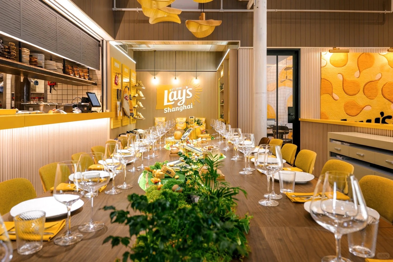 空间设计上,餐厅将土豆元素与艺术美学深度融合:一楼用餐区以土豆为墙面装饰,搭配薯片纹理墙面;二楼餐桌设置沙画式微缩景观,清晰呈现土豆从农场到工厂的转化过程。店内还设有品牌零售专区、土豆限定周边等等,将这场关于薯味的创意体验延伸至日常生活。