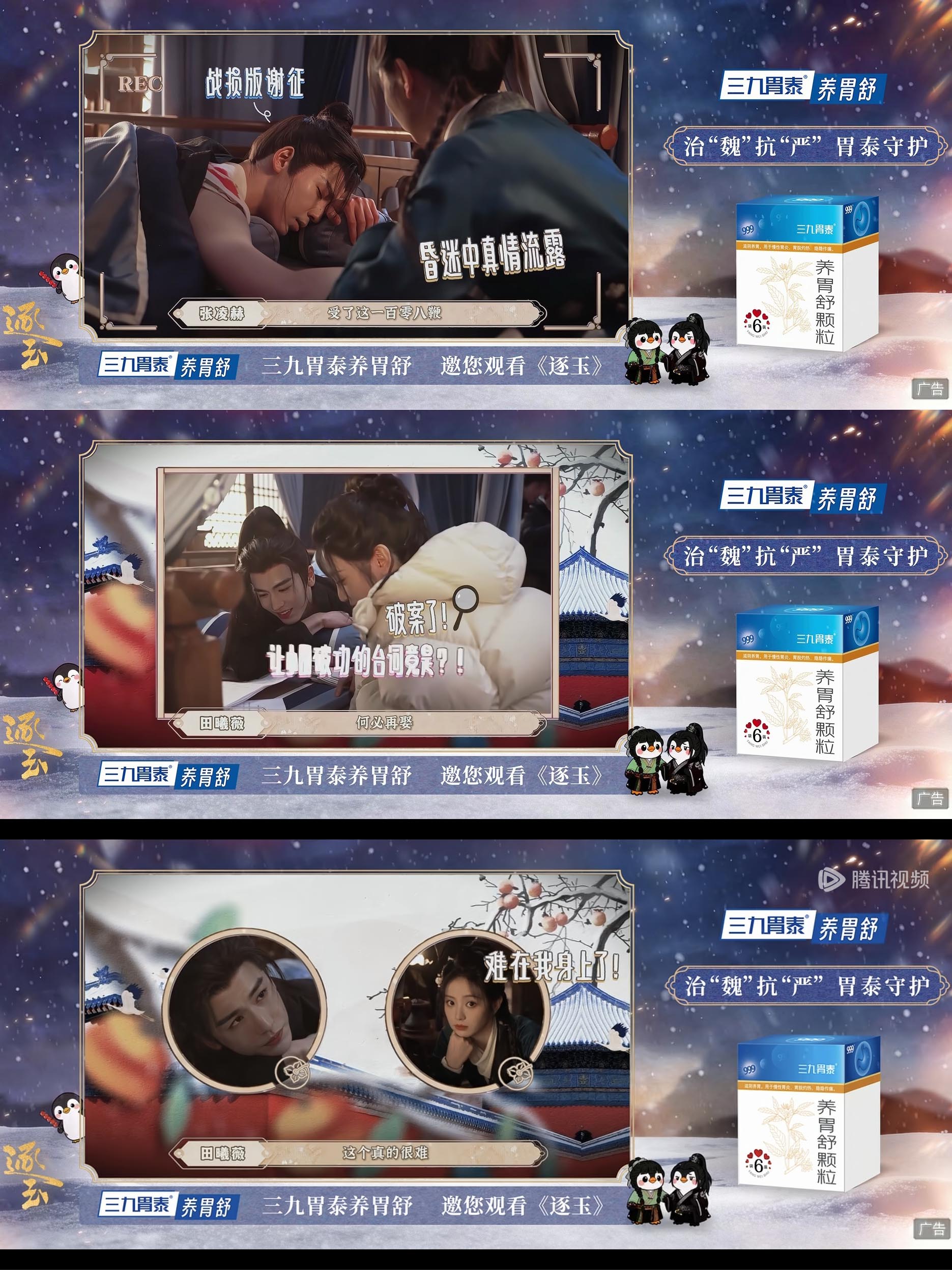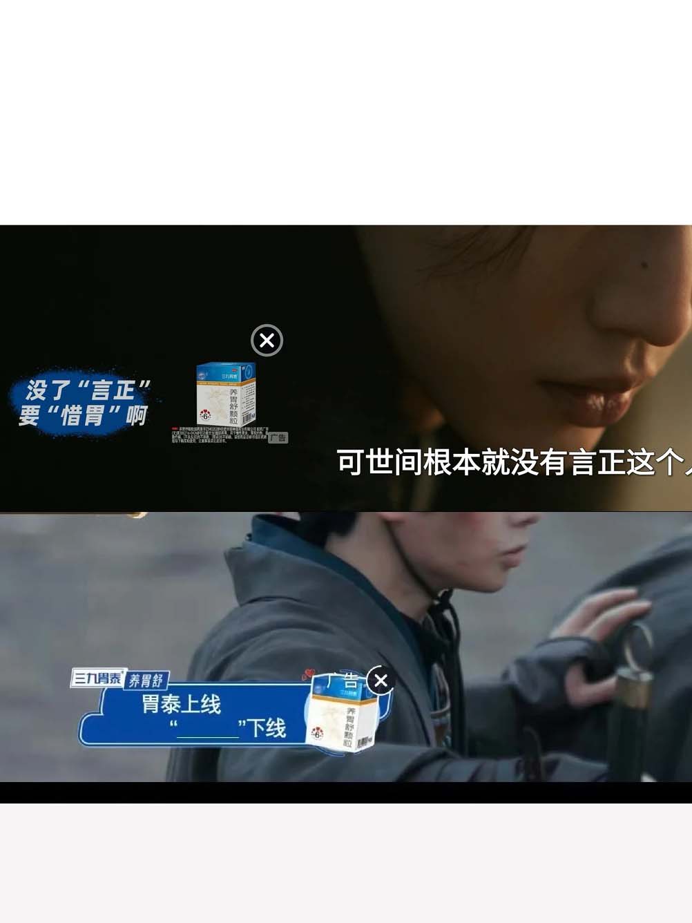 比如「言正」身份掉马的情节,三九胃泰的小广告就立马上线了「胃泰上线,『言正』下线!」以及「没了『言正』,要『惜胃』啊」,一切卡的刚刚好,一句话就把产品功能和剧情痛点绑在了一起。