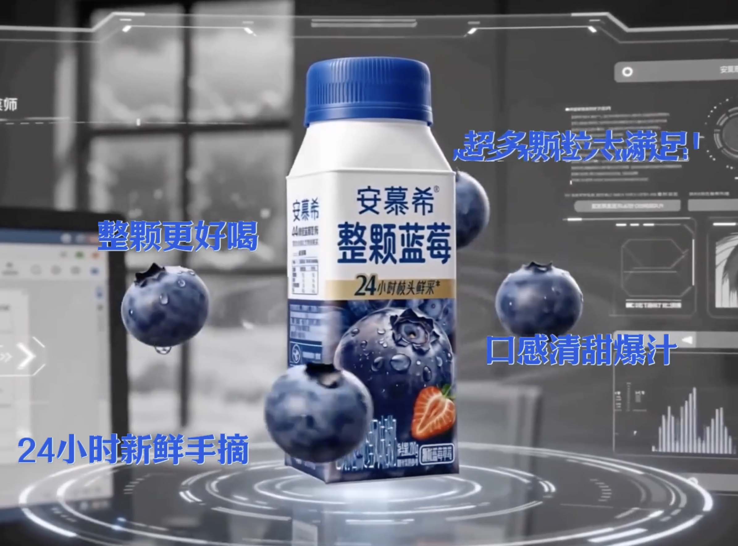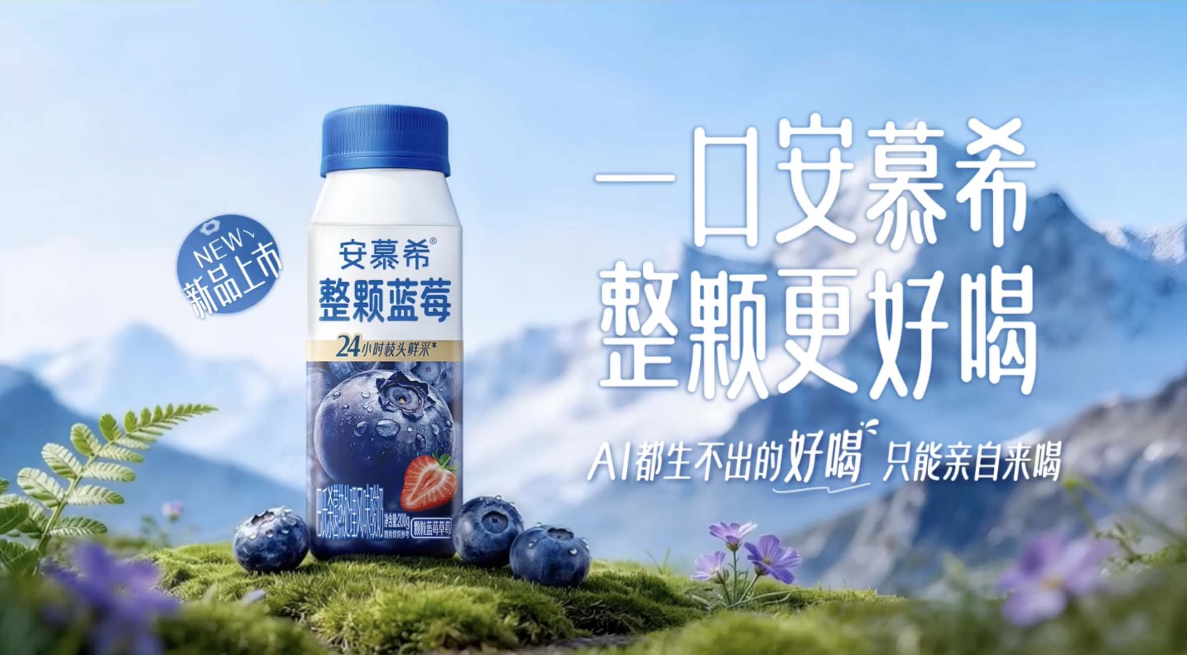 围绕「整颗蓝莓、果肉饱满有营养、24h 鲜采直达」等卖点,安慕希打破传统广告局限的既定脚本与拍摄手法,用 AI 技术演绎真实整颗蓝莓的好喝和美味,以无限想象冲破边界,做出属于 AI 时代的脑洞广告,「AI 都生不出的好喝,只能你亲自来喝」,去夯实安慕希「好喝」的产品印象,增强消费者产品好感与记忆度。