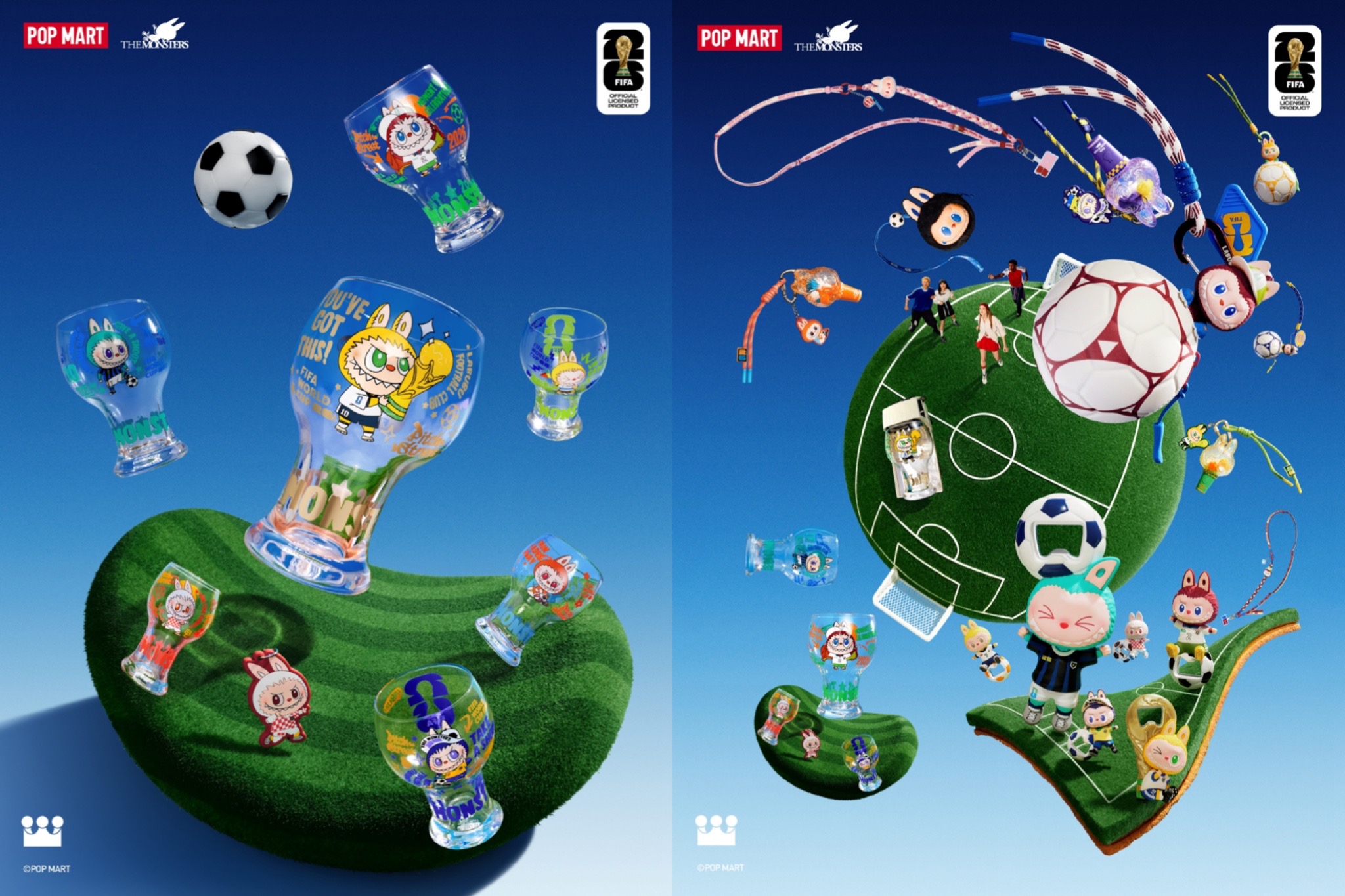 Catch the Win 搪胶毛绒公仔则将 LABUBU 塑造为绿茵场上的冠军球员,它身穿定制球衣,脚踩迷你足球鞋,双手比出胜利手势,怀抱可拆卸的大力神杯,兼具互动性与收藏价值。该系列同步推出长挂绳、迷你挂件灯、开瓶器冰箱贴、玻璃杯及足球迷你包,让世界杯的欢乐渗透日常每个角落。