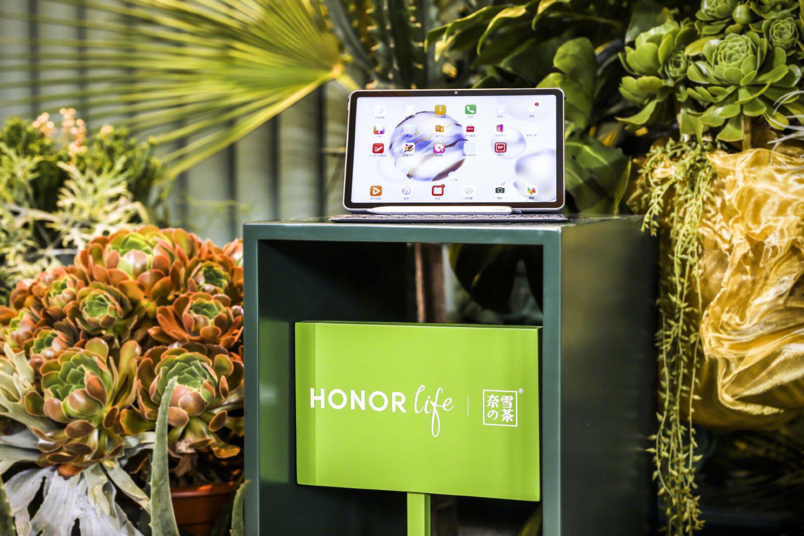 荣耀 HONOR 与奈雪的茶在上海环球港开启了科技潮饮快闪店,店内选用仙人掌、多肉及绿植搭配金属元素、镜面结构的设计,结合荣耀的一众科技产品呈现出了一个绿意盎然的智慧生活体验空间,更将生活潮流的美学表达全面升级。[SocialBeta 报道]