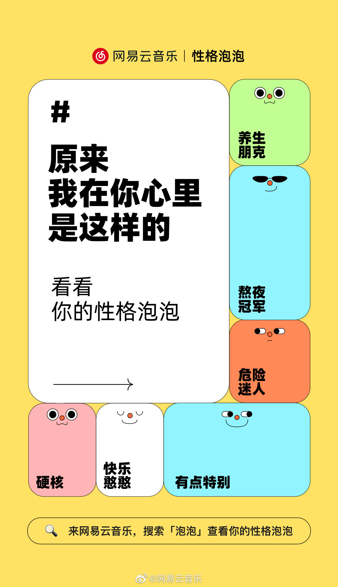 继性格主导色小测试后,网易云上线「性格泡泡」小测试。用户登录网易云音乐,从首页即可进入测试页面,看到有「快乐憨憨」、「熬夜冠军」、「工作狂」等多种「性格泡泡」。随后,用户可根据提示选择三个自我认为代表自己的「性格泡泡」,就能生成专属海报,并可将海报分享至朋友圈、微博等多种社交平台,邀请好友来为自己投票,选出适合自己的「性格泡泡」。以此,既能跟好友分享自己眼中的自己,又能认识到自己在好友眼中的性格。[SocialBeta 报道]