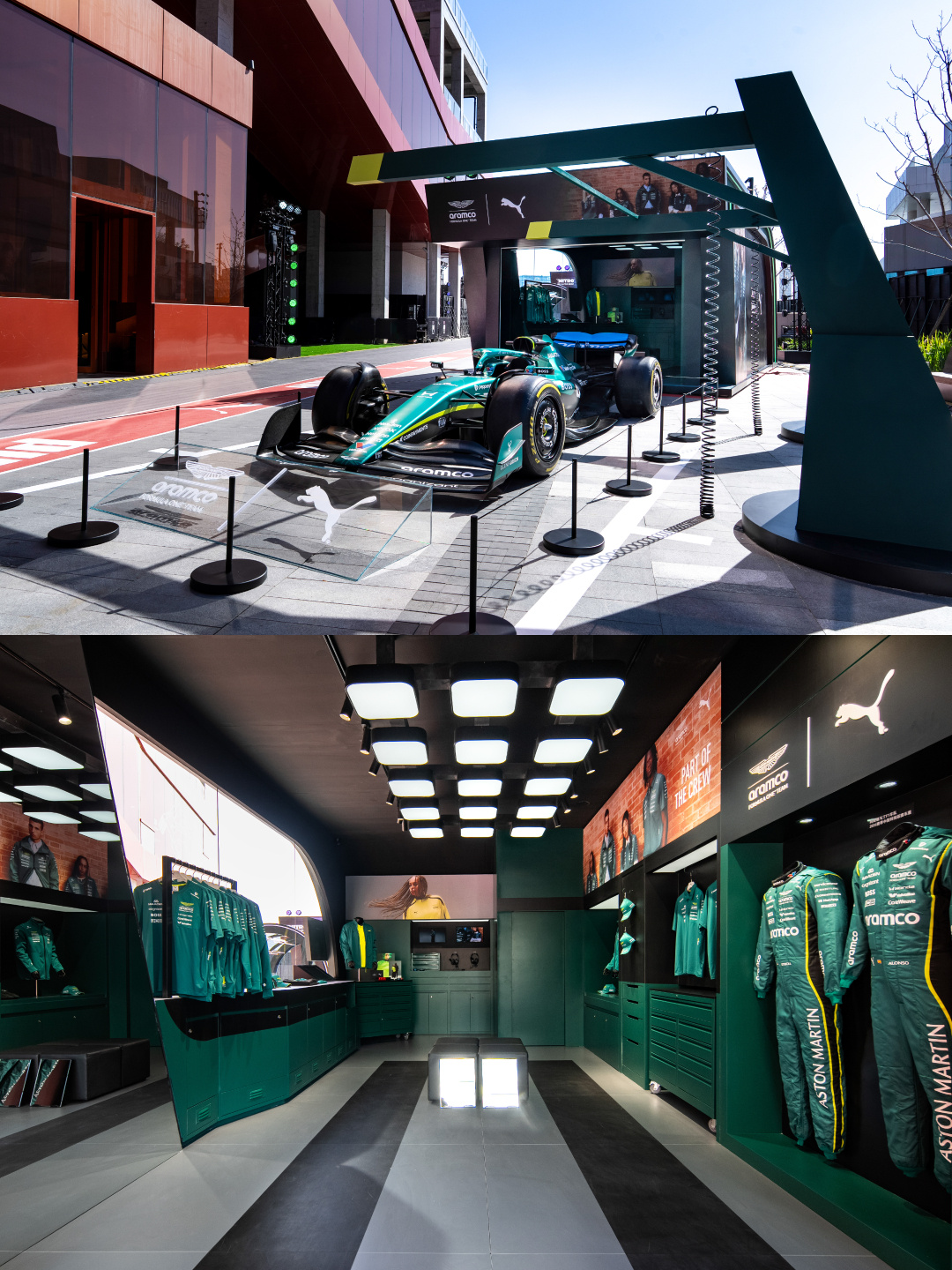 线下沉浸式联动聚焦 F1 中国大奖赛节点,打造多元场景体验,强化用户参与感。PUMA 于上海西岸梦中心打造「轰鸣之外」赛车主题沉浸式快闪空间,以三大车队 P 房为蓝本,高度还原法拉利、迈凯伦、阿斯顿马丁的赛车及维修区实景,设置巨型车手装置、车队电台体验、维修站模拟操作等互动环节,同时融入 PUMA NITRO 科技空间与潮流空间,展示搭载尖端科技的跑鞋及经典薄底鞋款,让车迷近距离感受赛道文化与品牌科技的融合。